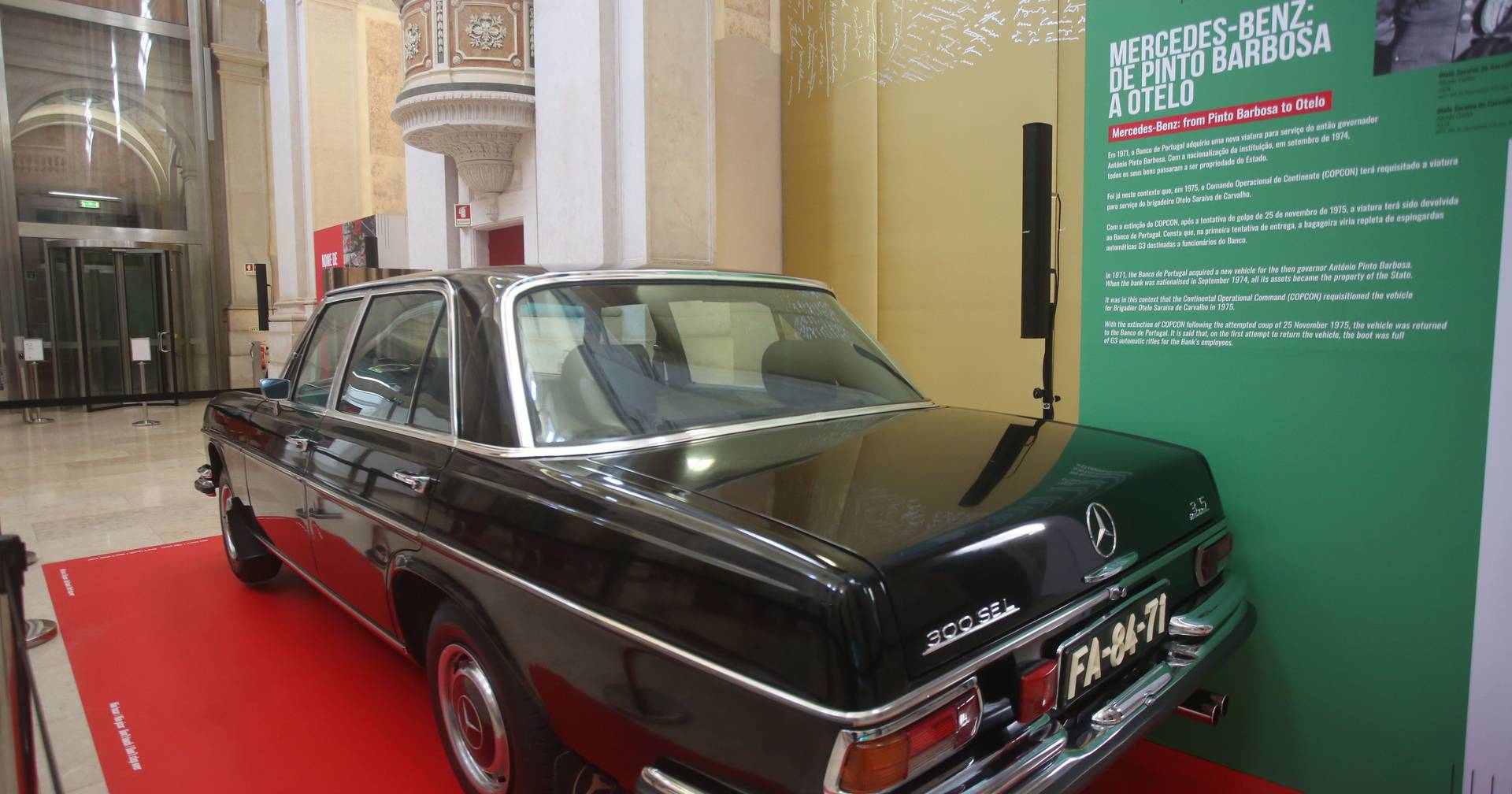 Logo no ampla primeira sala está exposto o Mercedes Benz de serviço do diretor do Banco de Portugal à época do 25 de Abril que logo foi desviado para uso do Otelo pois claro… A sua revolução decerto que não seria para o colocar sob a tutela de um qualquer soviete de soldados e marinheiros, mas sim para ser o seu soberano iluminado à Castro com o qual esse imbecil até se achava comparável (dizia qualquer coisa sobre tomar o cavalo branco do poder ou outra idiotice do estilo…).