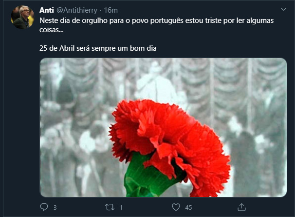 “Neste dia de orgulho para o povo português, estou triste por ler algumas coisas… 25 de Abril será sempre um bom dia”, escreveu Anti no Twitter.