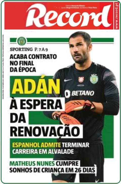 Podemos ir mais longe, porque sabe Record que Adán até admite terminar a carreira em Alvalade: já em idade avançada para profissional, não pretende, sabemos, prolongar muito um caminho iniciado em 2008, no Real Madrid. Em Portugal, está feliz, no plano desportivo e pessoal, com a mulher e o filho. Ao mesmo tempo, sabe que há equipas do seu país que continuam atentas à sua situação e que no verão já tinham ouvido um ‘não’ quando o sondaram, dada a vontade de continuar aqui; a partir de janeiro, e caso não haja avanços, Adán vai querer ouvir intenções. Os leões têm até dia 31 de maio para acionar esta opção.