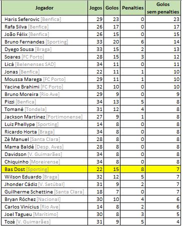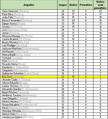 Para quem gosta de estatísticas, aqui vai outra: em anexo, lista dos melhores marcadores da liga (sem penalties).
