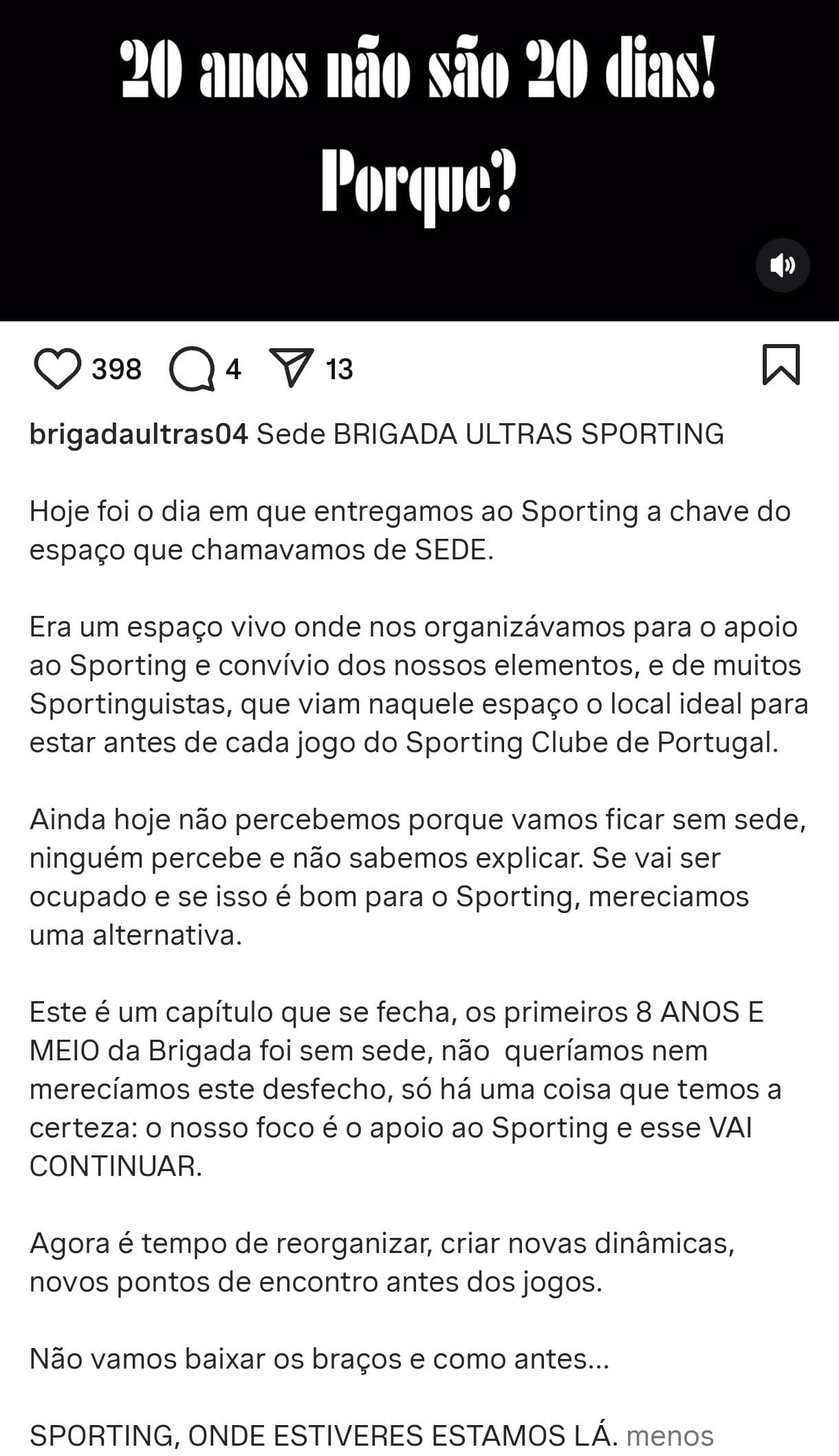 fica a atitude da Brigada de não se opor a tomada de posição do Sporting, como já vimos antes noutros sítios, e bem. não se esqueçam “passam jogadores, dirigentes, treinadores e presidentes também…”