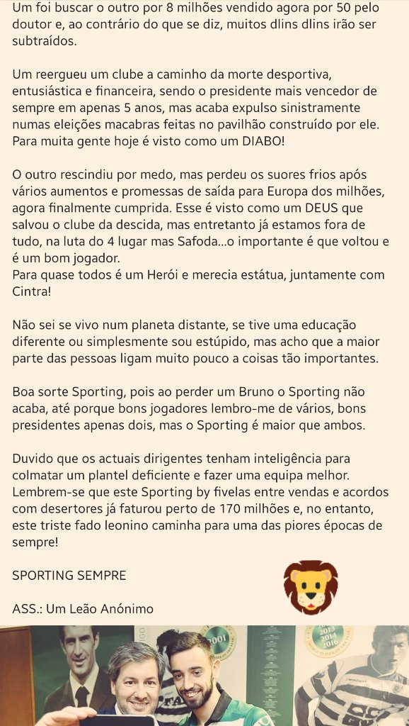 PS. Até adivinhei esta última, deliram com uma possível venda. Enganam lá alguém vocês? Pobre Sporting que tem de levar com esta gente aqui alapada, podia lá alguma este clube chegar a algum lado? Só se um dia se conseguir livrar de vocês.