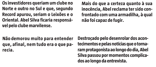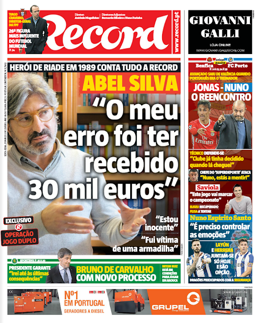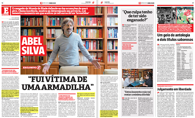 Curiosamente, o Record veio logo em socorro de Abel Silva e no próprio dia em que é fica com o estatuto de arguido dá uma entrevista no escritório dos seus advogados ao jornal. Um entrevista que virou capa de jornal e que conta apenas com duas páginas e meia dúzia de perguntas perfeitamente colocadas para passar a mensagem que o homem é inocente.
