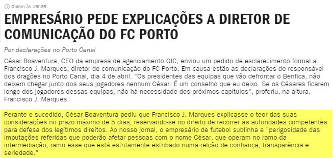 No programa “Universo Porto - Da Bancada” da semana passada, Francisco J.Marques proferiu uma frase que tem sido ignorada por praticamente toda a imprensa. Na altura o director de comunicação dos dragões disse:“Os presidentes das equipas que vão defrontar o Benfica, não deixem chegar junto dos seus jogadores nenhum César. É um conselho que eu deixo. Se os Césares ficarem longe dos jogadores dessas equipas, não há necessidade dos próximos capítulos”