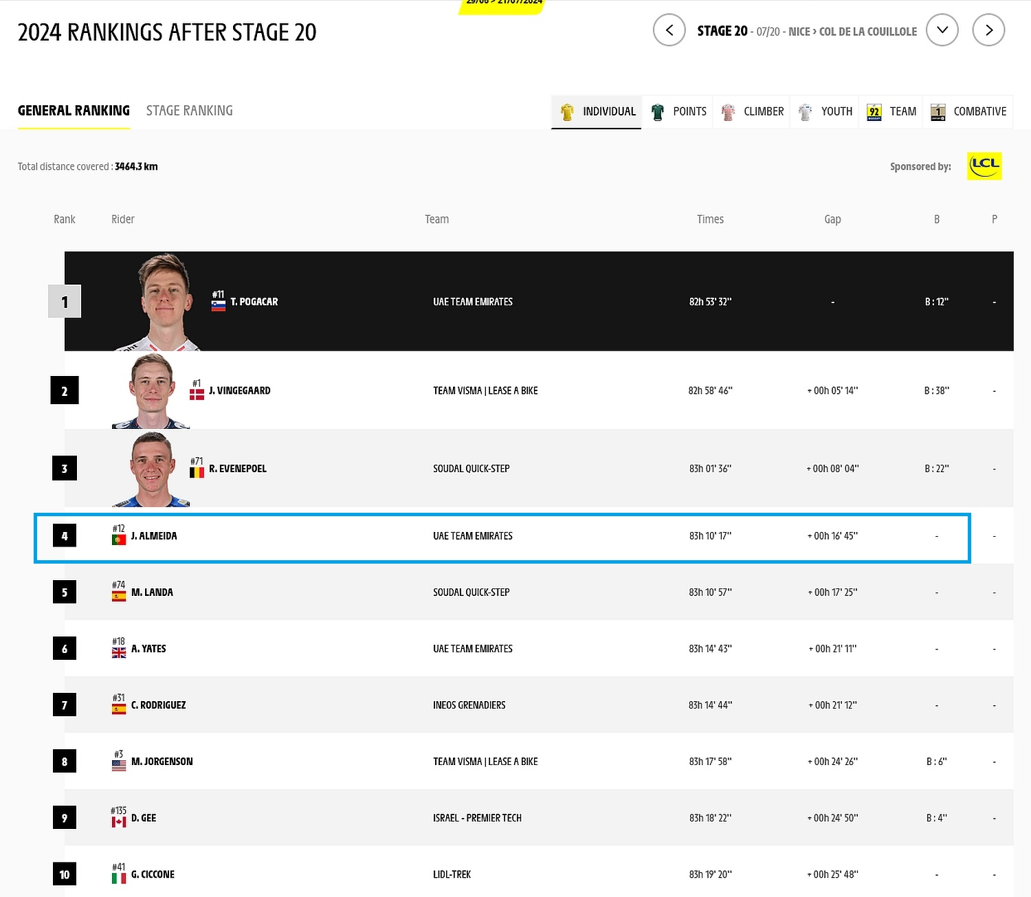 4º João Almeida (UAE TEAM EMIRATES), marcando a equipa um domínio incontestado na Geral por Equipas.