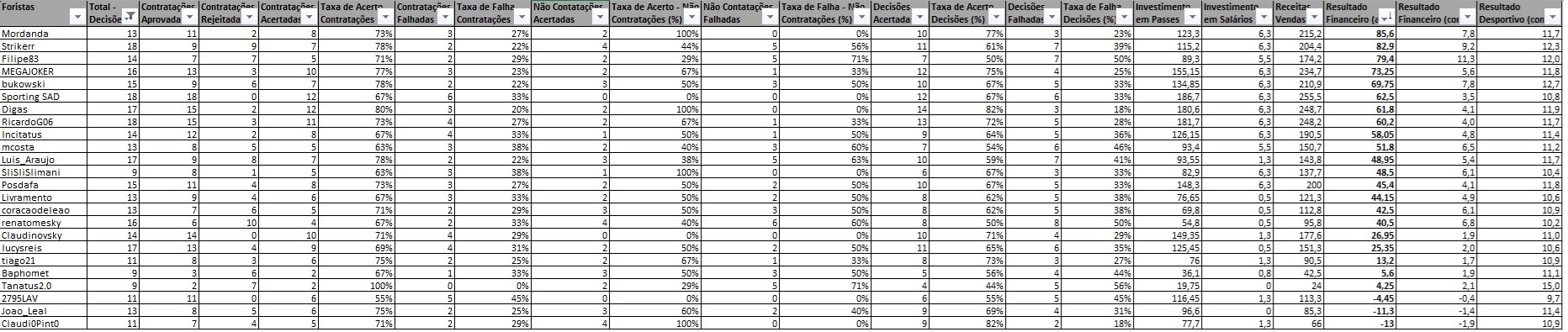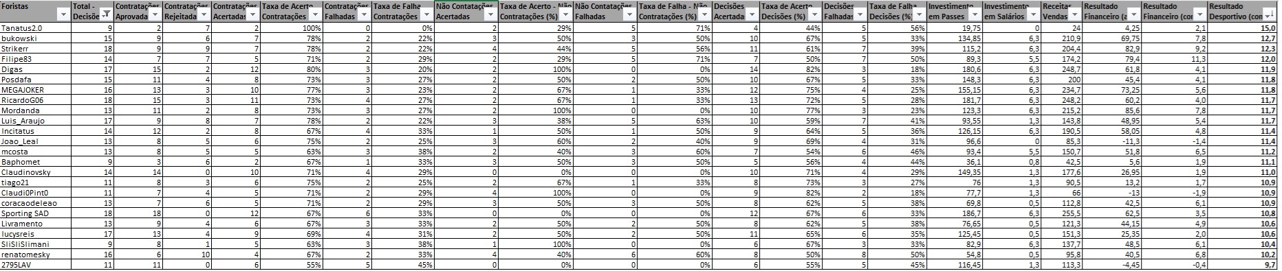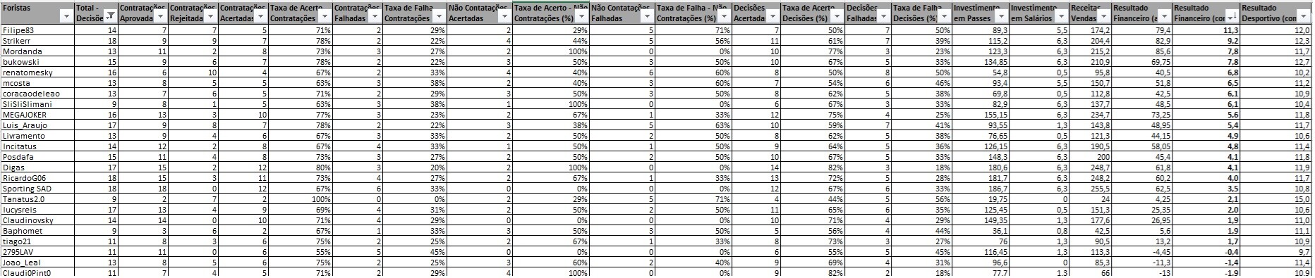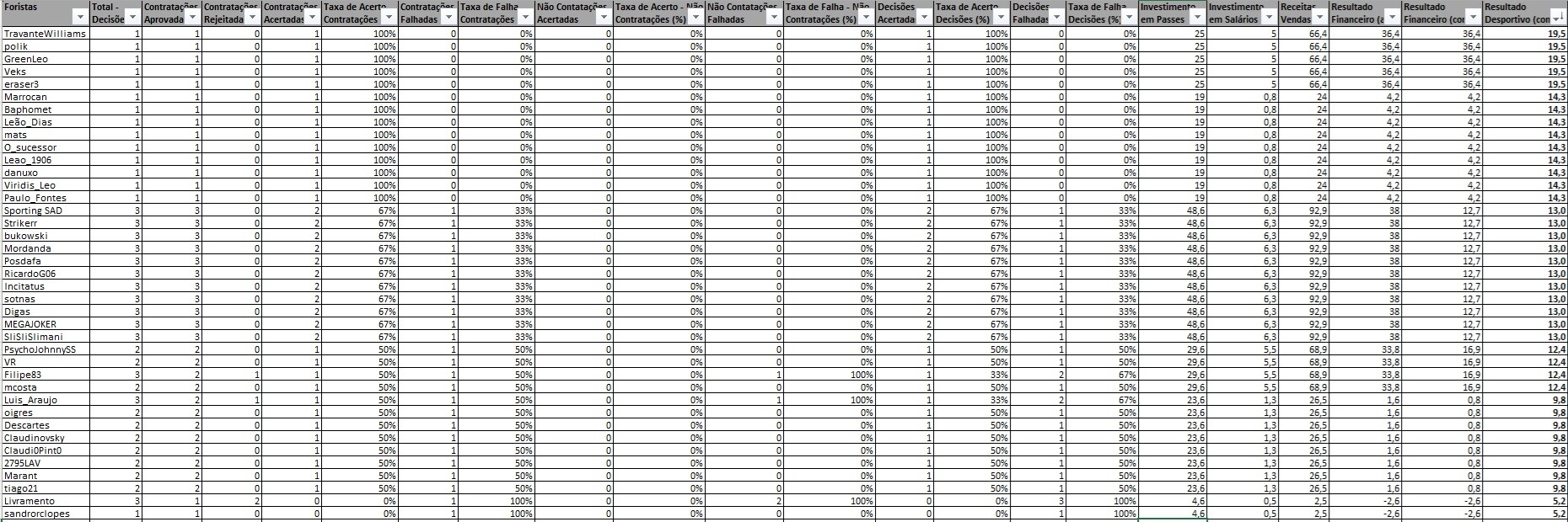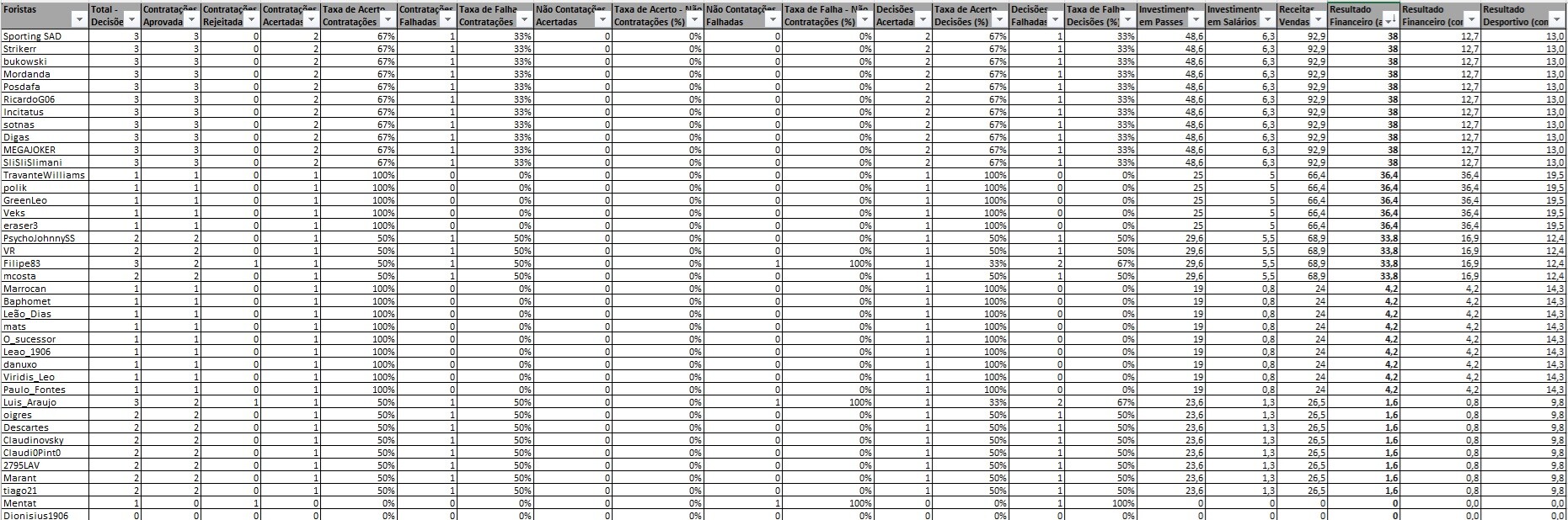 - Chamo também atenção para o facto do número de participações de cada forista também poderem afetar bastante os resultados (coluna [Total - Decisões]].