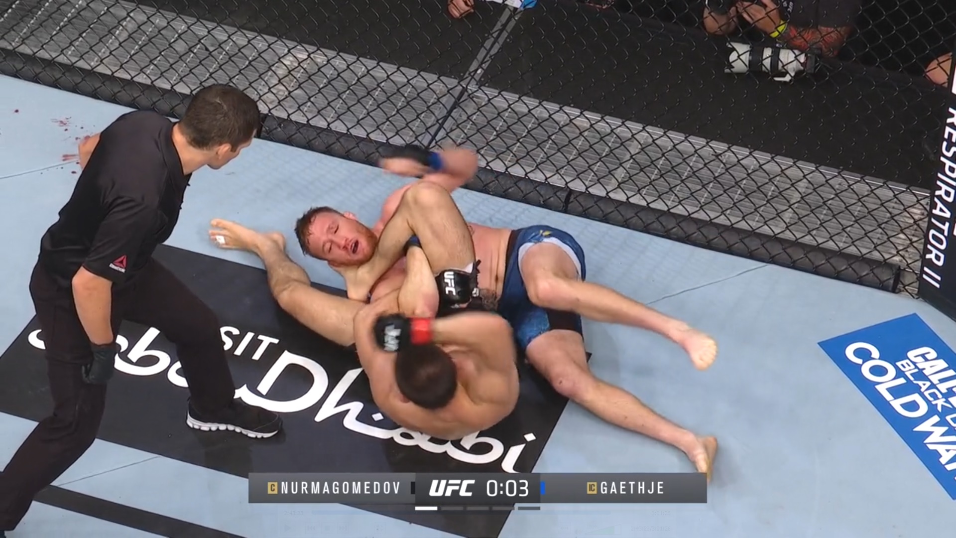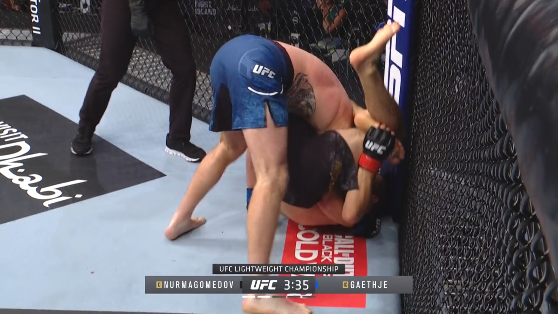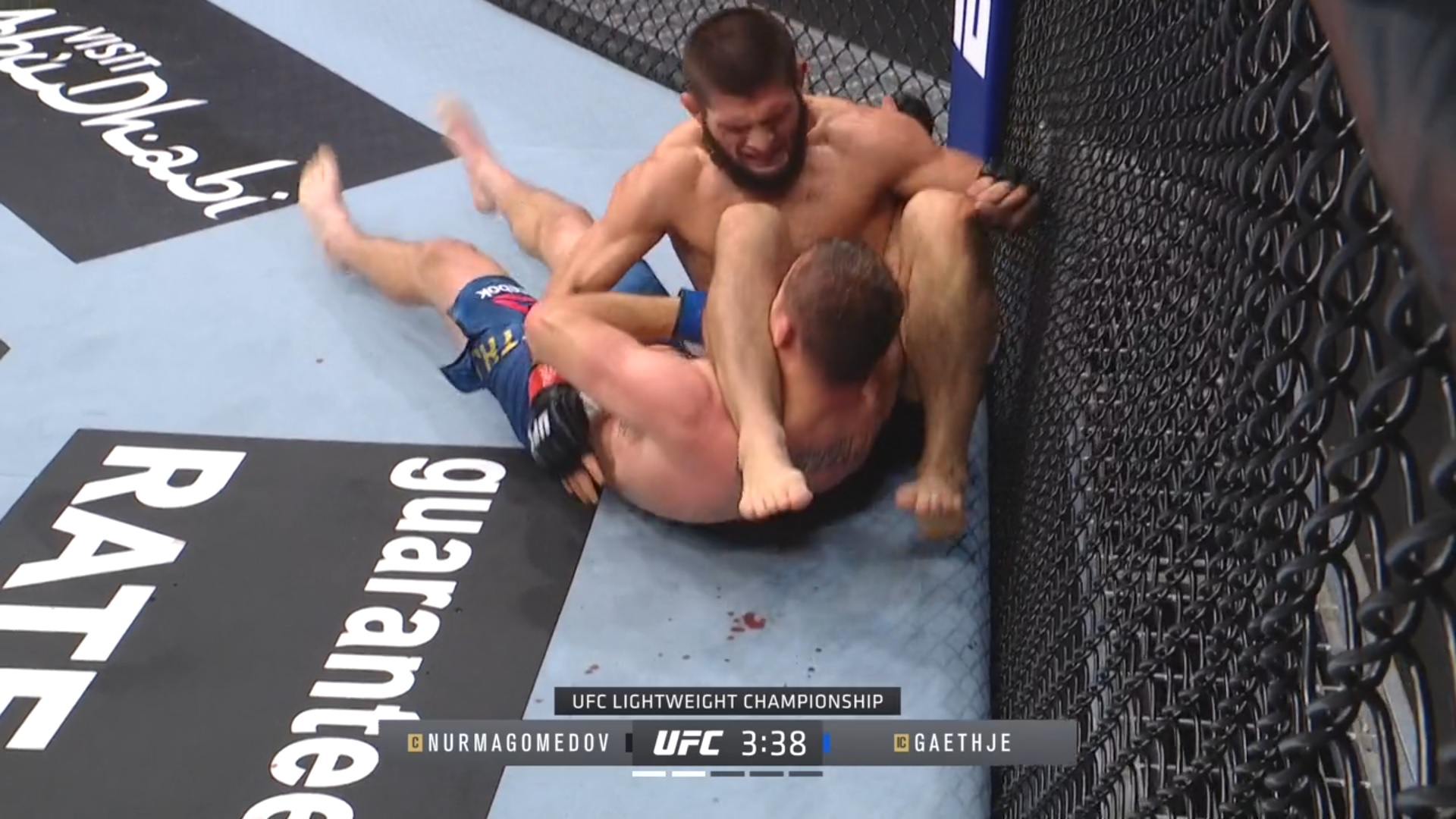 Quando finalizou acho que tentou logo ir para o triângulo quando ainda estava por cima, depois até pareceu que ia perder a posição, mas quando o Gaetjhe ficou por cima o Khabib conseguiu encaixar logo rapidamente e fechar o triângulo.