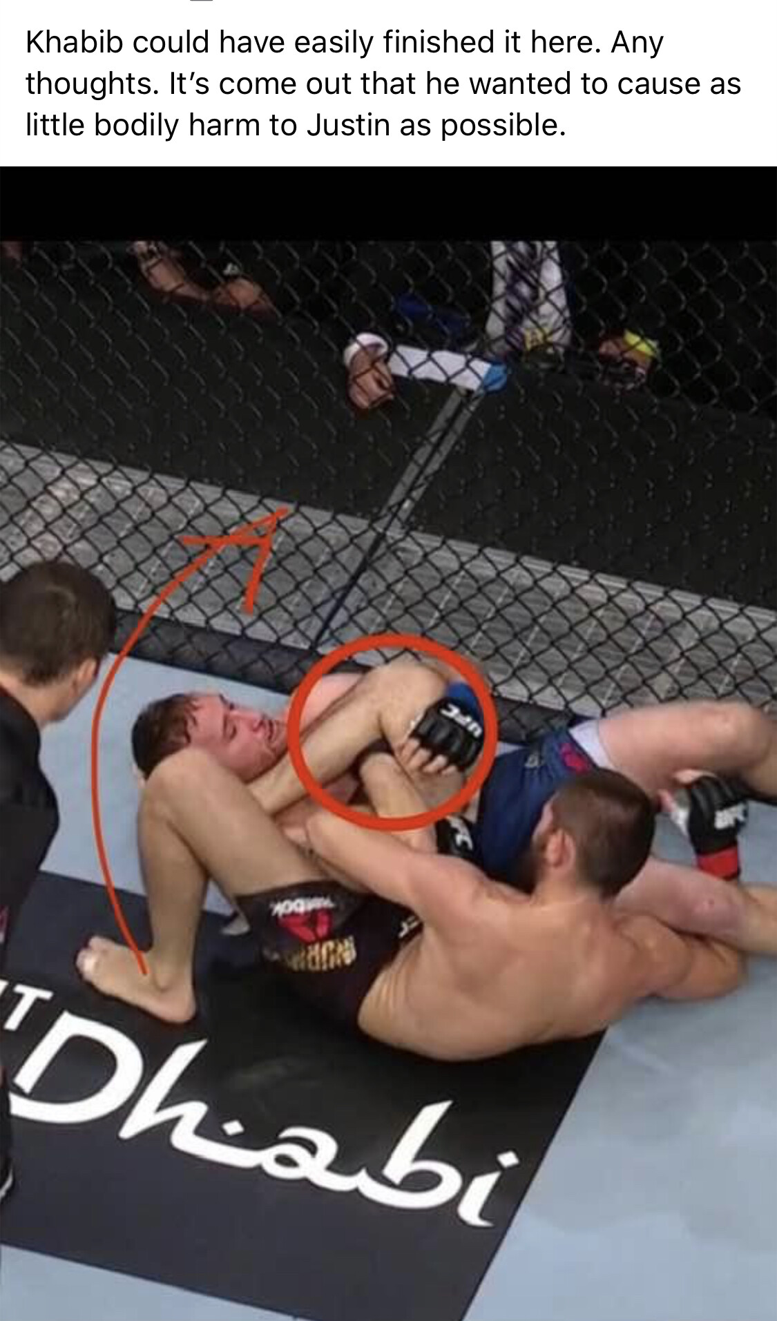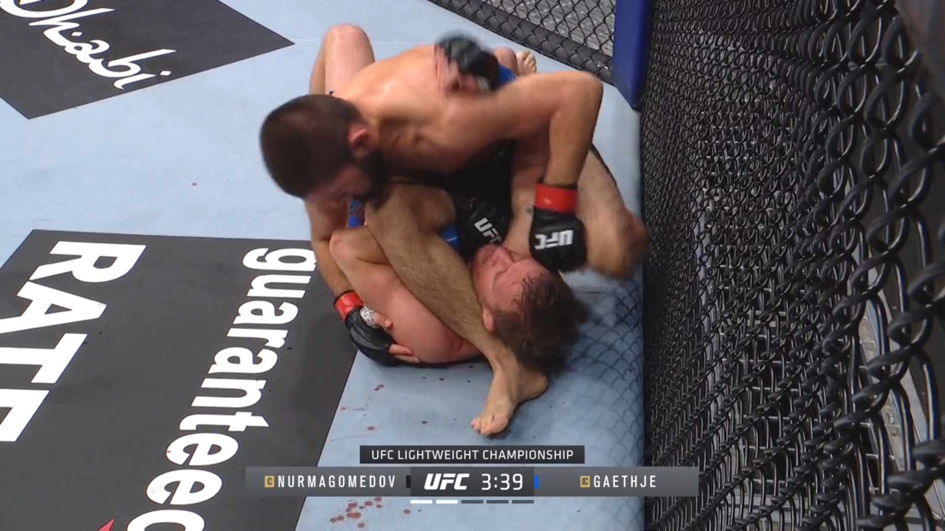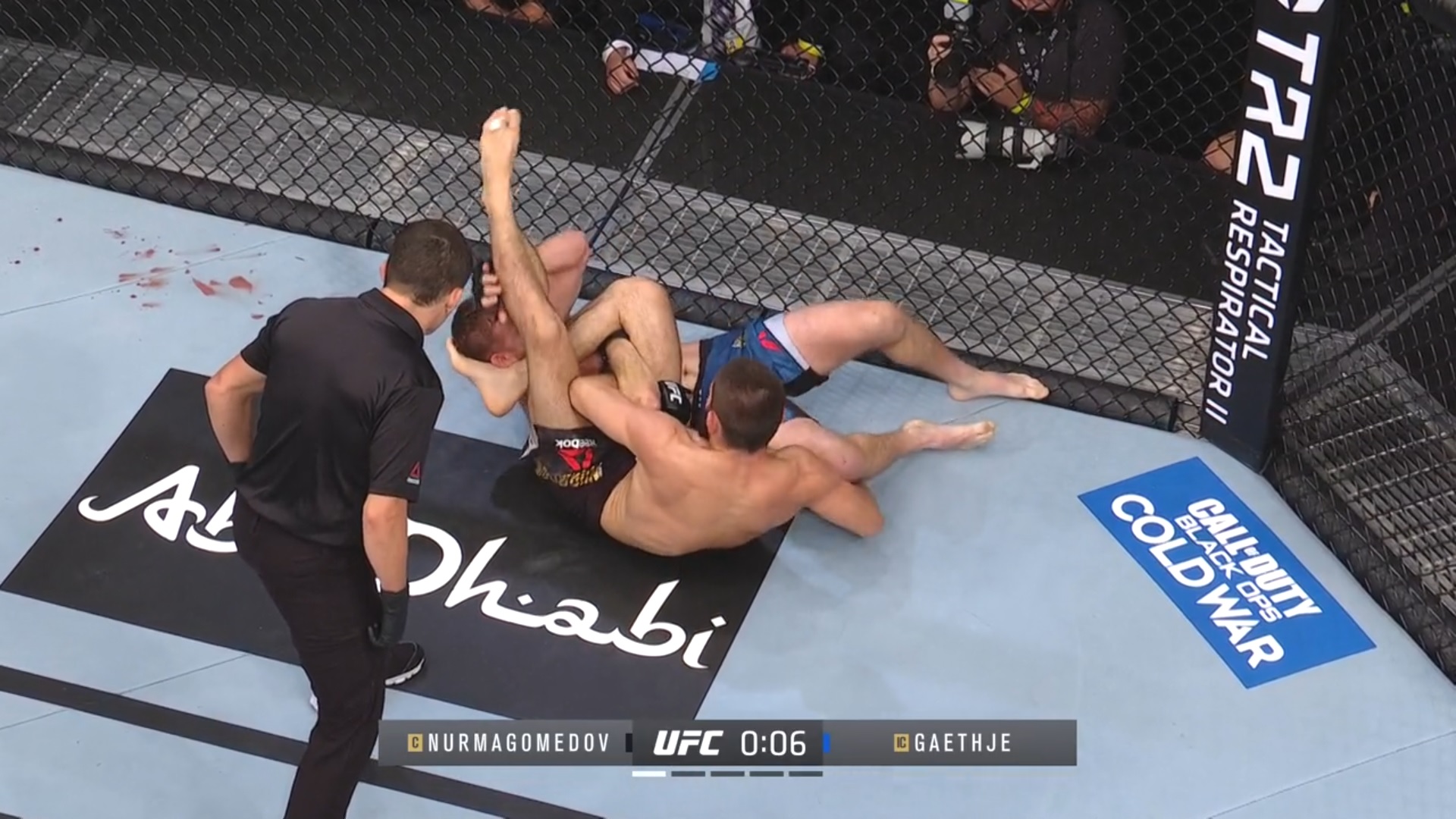 Quando finalizou acho que tentou logo ir para o triângulo quando ainda estava por cima, depois até pareceu que ia perder a posição, mas quando o Gaetjhe ficou por cima o Khabib conseguiu encaixar logo rapidamente e fechar o triângulo.
