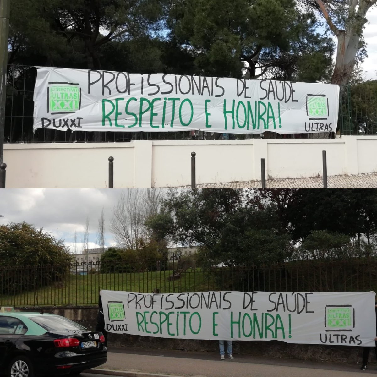 Começámos as nossas ações de solidariedade com uma frase de força e incentivo a todos os profissionais de saúde, dia 17 de março a qual foi colocada em frente ao Hospital Santa Maria: “PROFISSIONAIS DE SAÚDE, RESPEITO E HONRA!”. Esta mensagem teve prontamente uma resposta, por parte de profissionais no local que saíam e entravam no hospital agradecendo desde logo. Este foi sem dúvida um incentivo extra e um grande impulso para as futuras ações que iríamos fazer.