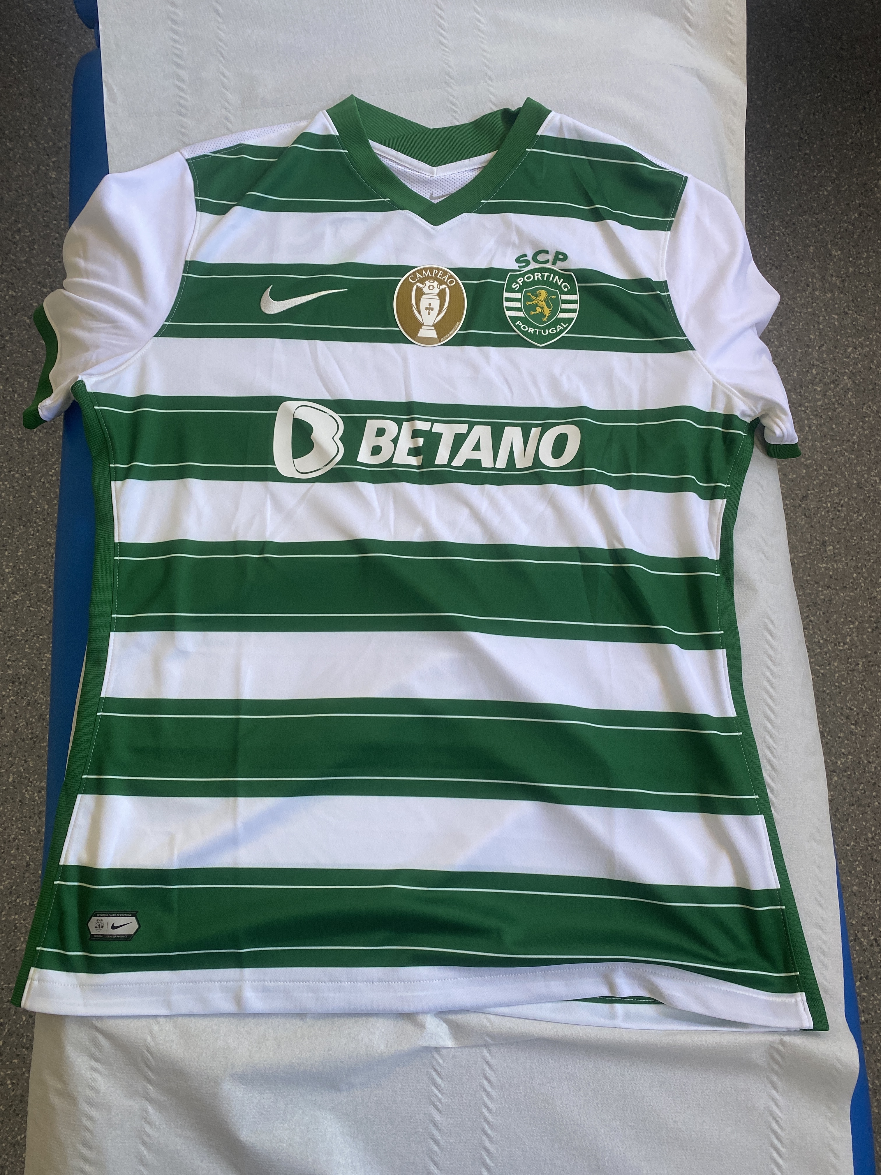 É outra coisa… acho q já que o patch do campeão e o símbolo do SCP são estampados em borracha, o símbolo da Nike tb deveria ser… Por uma questão de coerência… mas não, é bordado… tudo parece ser retirado do catálogo e estampado símbolo do Sporting e de campeão, publicidade e já está…