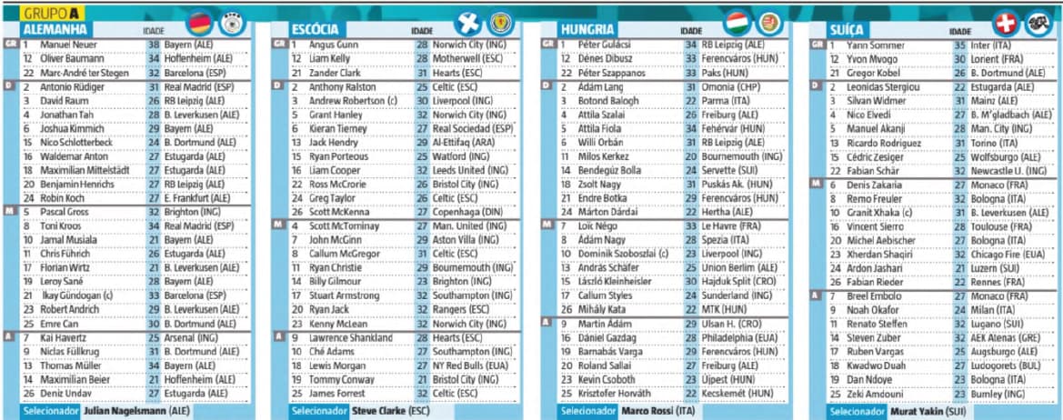 Neuer, Kimmich, Tah, Rudiger, Mittelstadt, Andrich, Kroos, Gundogan, Musiala, Wirtz e Havertz