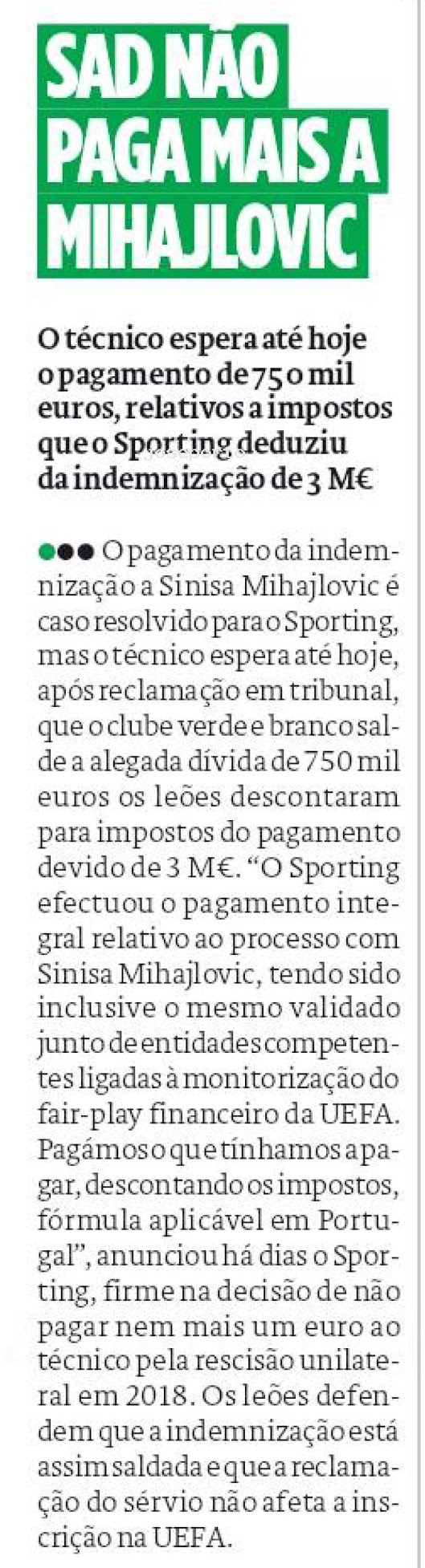 Sinisa Mihajlovic, que assumiu o comando do Bolonha, abordou a curta passagem pelo Sporting e revelou que existiu um diferendo entre o antigo presidente e o presidente da Comissão de Gestão do Sporting,Sousa Cintra, e por isso não ficou em Alvalade.