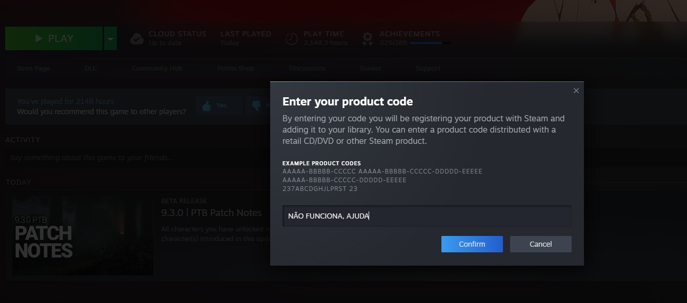 Confirma primeiro se não trocaste algum O por um 0 e se meteste o “ - “ corretamente. Se tiveres a certeza, tira print dentro da página da Steam com o código, mais ou menos assim: