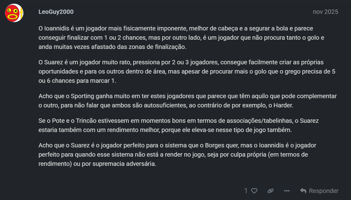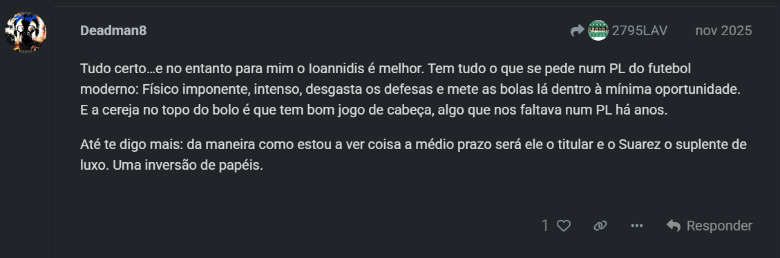 Não há falta de memória Zacker, é exatamente o que te disse, havia quem o pedisse a titular mas a sensação de quem era o titular neste sistema era e sempre foi o Suárez. Nem sei porque é que isto é tema sinceramente, porque o Ioannidis esta época não conta mais