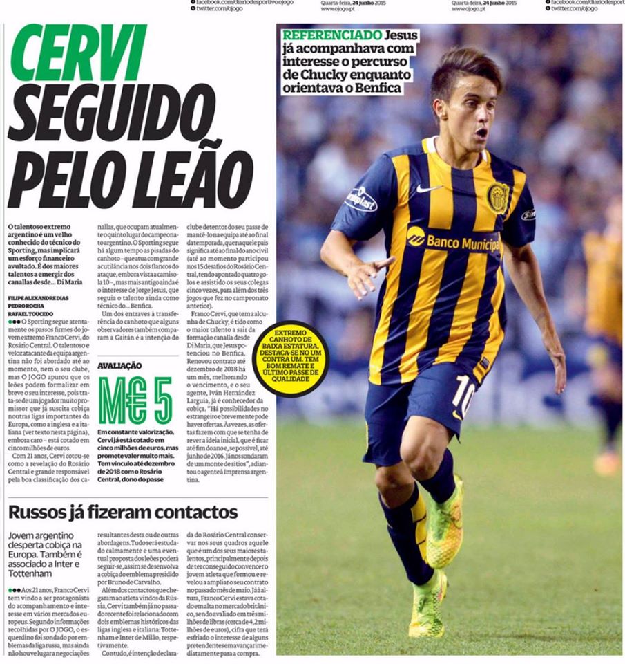 Este tipo de aquisições, ainda por cima num sobrevalorizado mercado sul-americano, para mim não Cervi. Este perfil de jogador, para o qual teríamos de pagar 4M a 6M, temos cá nós o Gauld, o Iuri, o Gelson, o Matheus, o Chaby, o Podence, sei lá…
