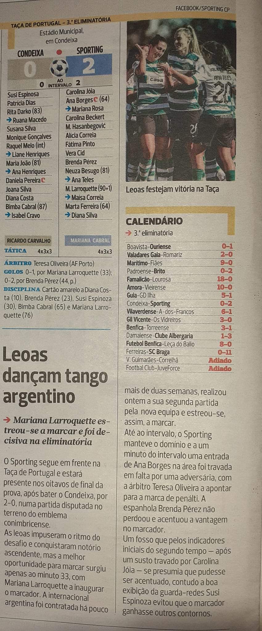 A equipa principal feminina de futebol do Sporting Clube de Portugal visitou e venceu, neste domingo, o Clube Condeixa ACD por 0-2 no jogo da terceira eliminatória da Taça de Portugal. Assim, as Leoas seguem em frente na prova-rainha, garantindo um lugar nos oitavos-de-final.