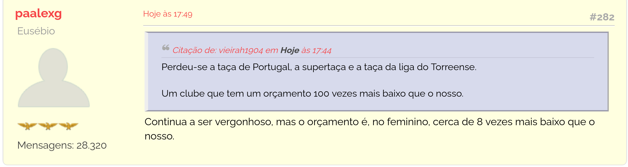 E a jogar com 10 50 minutos. Podiam por os olhos no torrense, que vai em 3 vitórias contra carnidagem que deu 2 títulos e uma final, duvido que tenham orçamento maior que o nosso e fazem bem mais que as nossas