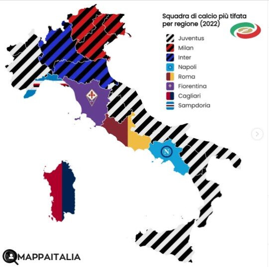 A juventus é o único clube verdadeiramente nacional em Itália. É o clube mais popular em regiões nada a ver com o Piedmont como a Sicília ou a Apulia. Um em cada três italianos adeptos de futebol torce pela Juventus.