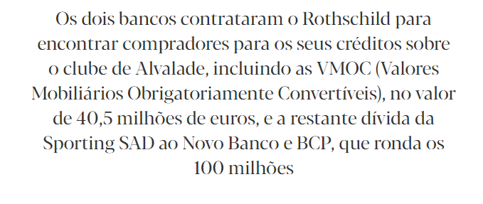 Em outubro de 2019, a SAD assinou com os dois bancos um acordo de reestruturação que procedeu à alteração dos termos da opção de compra dos VMOC, tendo sido fixado um preço unitário de 0,30 euros por VMOC, o que corresponde a um “desconto” de 70% na dívida.