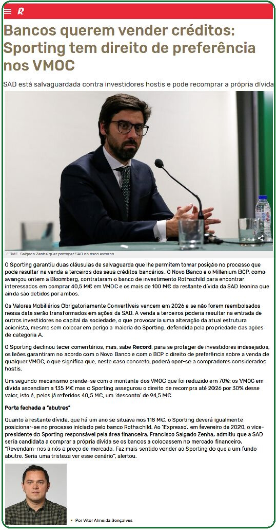 Quanto a uma eventual perda da maioria da SAD por parte do Clube, o ex-dirigente leonino recorda que “os bancos só podem vender as VMOC’s se o Sporting entrar em default. Isso nunca aconteceu e, por isso, a posição do Clube está defendida”, acrescentando que “os bancos querem vender as VMOC’s. No final do dia, e tendo em conta as ‘perdas’ que já reconheceram nos balanços, até acabam por ganhar dinheiro. Vão fazer com o Sporting o que já fizeram com outros clubes”.