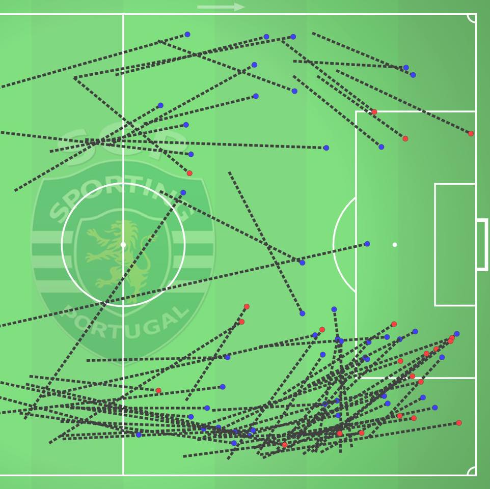 ◉ As coisas podem nem sempre lhe correr bem mas Catamo foi dos mais ambiciosos da Liga na hora de partir para cima dos adversários em “cavalgada” com bola. Com 7⃣6⃣ conduções progressivas (mapa anexo), apenas um jogador ficou acima dele na prova e é fácil adivinhar qual… esse mesmo, o colega Gyökeres (com 95)