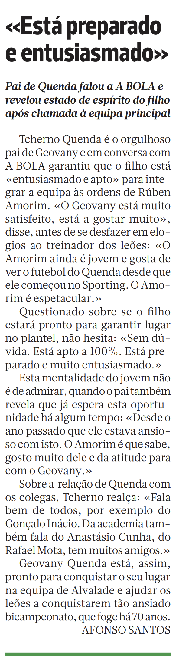 Não tenho dúvidas que mesmo na ala o Quenda pode ser uma surpresa, no entanto tem todas as características para rebentar é como “extremo interior”.