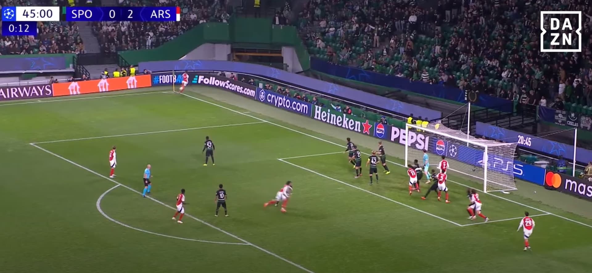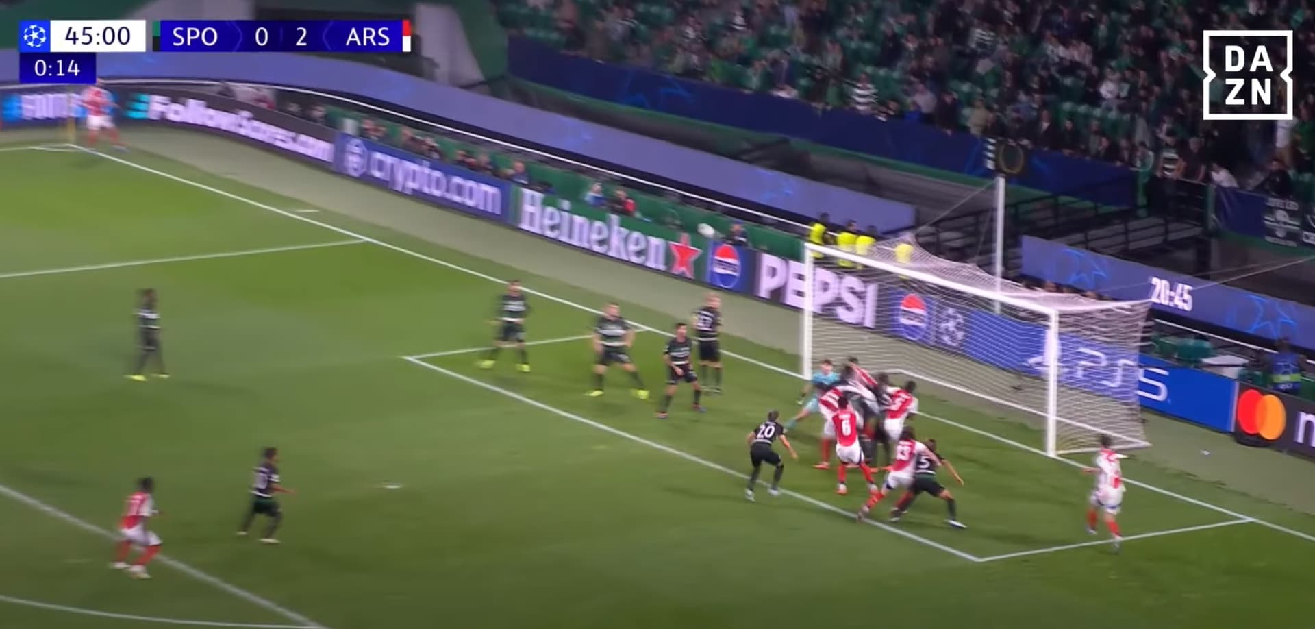 bola no 2º poste para ser disputada pelo Gabriel ou Havertz que estão completamente isolados. golo fácil.
