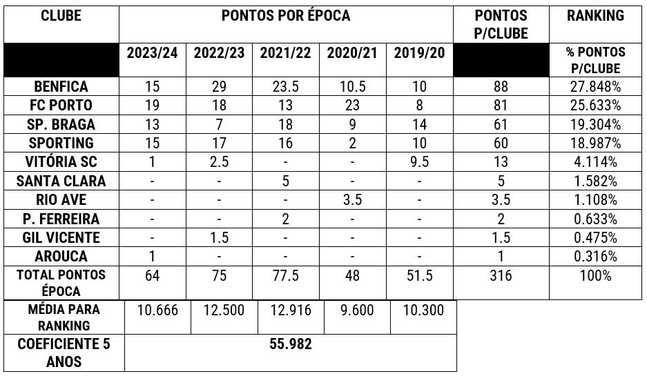 Vamos agora olhar para a Europa e o contributo que da consecutivamente . Com um investimento que é de apenas 62% do Benfica, consegue um resultado muito próximo do mesmo, como vemos no quadro abaixo (contributo pontos para ranking europeu):