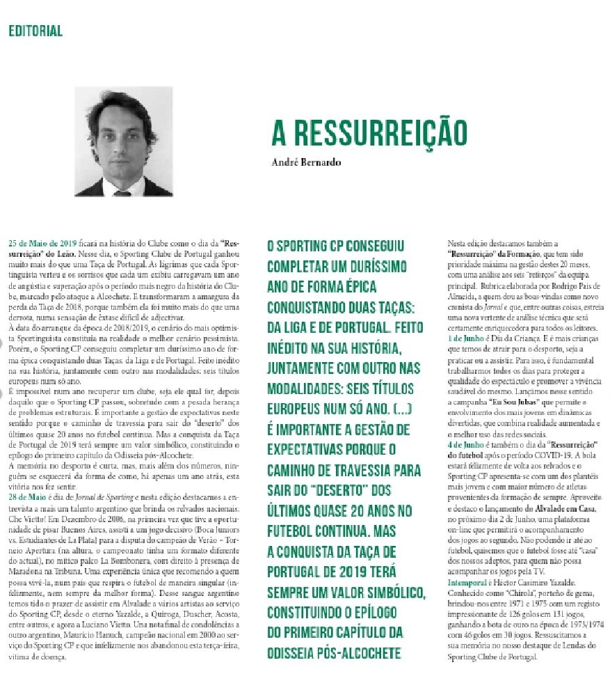 A diferença estará certamente nos actos que a concretizem e, cingindo-me por agora ao Jornal, a edição especial de celebração dos 98 anos do Jornal Sporting representou precisamente uma alteração de paradigma . Apresentámos um novo grafismo e design, mas as mudanças são sobretudo de substância. Esta nova versão carrega uma linha editorial diferente, que visa aproximar ainda mais o leitor da vivência com o Clube e, se o faz com uma visão futura em sincronização com o actual contexto da era digital, recupera também 113 anos de história.