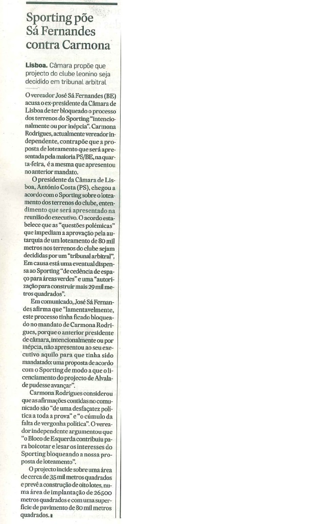 A polémica em torno dos terrenos do Sporting foi desencadeada no mandato anterior pelo vereador do Bloco de Esquerda, José Sá Fernandes, que em Abril ameaçou fazer queixa ao Ministério Público caso a proposta de loteamento fosse aprovada, considerando que violava o Plano Director Municipal (PDM).