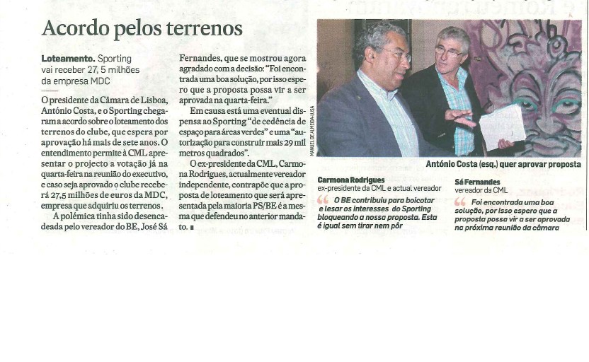 [size=12pt][b]CML chega a acordo com Sporting sobre terrenos do clube[/b][/size]O presidente da Câmara de Lisboa, António Costa (PS), chegou a acordo com o Sporting sobre o loteamento dos terrenos do clube, entendimento que será apresentado quarta-feira na reunião do executivo, disse hoje à Lusa fonte do Município.