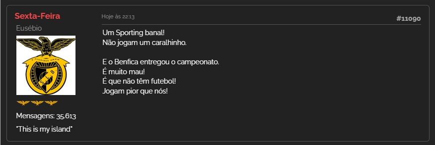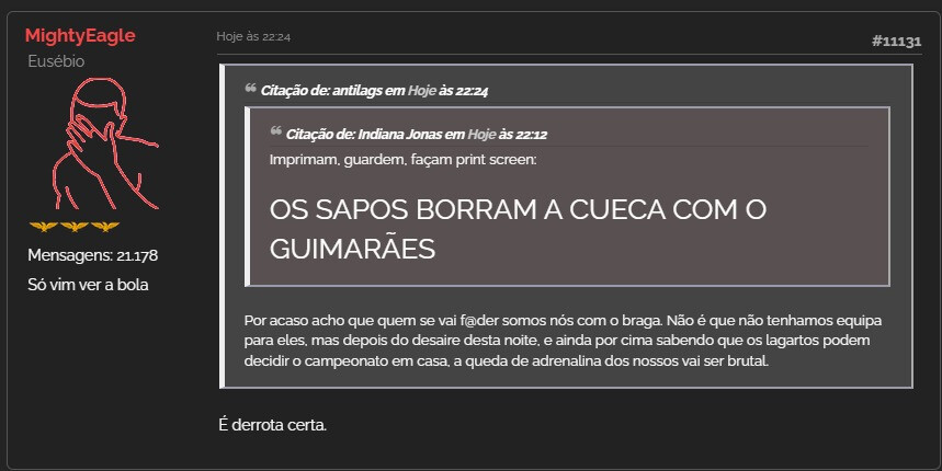 Desapareceu quase tudo a seguir do fim do jogo. Parece que o jogo não foi na estrumeira, foi logo a mostraram cenas em Alvalade. Tal o melão e claro a bazofia em acreditar que podiam ser campeões hoje.
