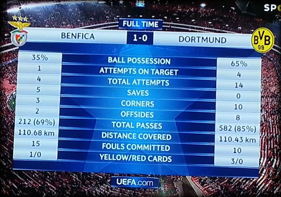 Fala-se que dominamos o Dortmund nas 2 vezes e não ganhamos. Certo. Será que a melhor estratégia a usar contra o Dortmund seria dominar ou deixarmo-nos dominar? Eles foram inteligentes, jogaram com as linhas recuadas, sempre atrás da bola, bloqueando assim os espaços nas costas (onde sofrem grande parte dos golos) não permitindo aos gajos rápidos do Borussia na frente ganharem bolas no espaço. É verdade que vão levar com mais remates, mas esses remates á partida serão menos propicios a golo do que seriam os remates no caso das linhas jogarem mais subidas, porque esses poderiam até acontecer 1x1 com o GR.