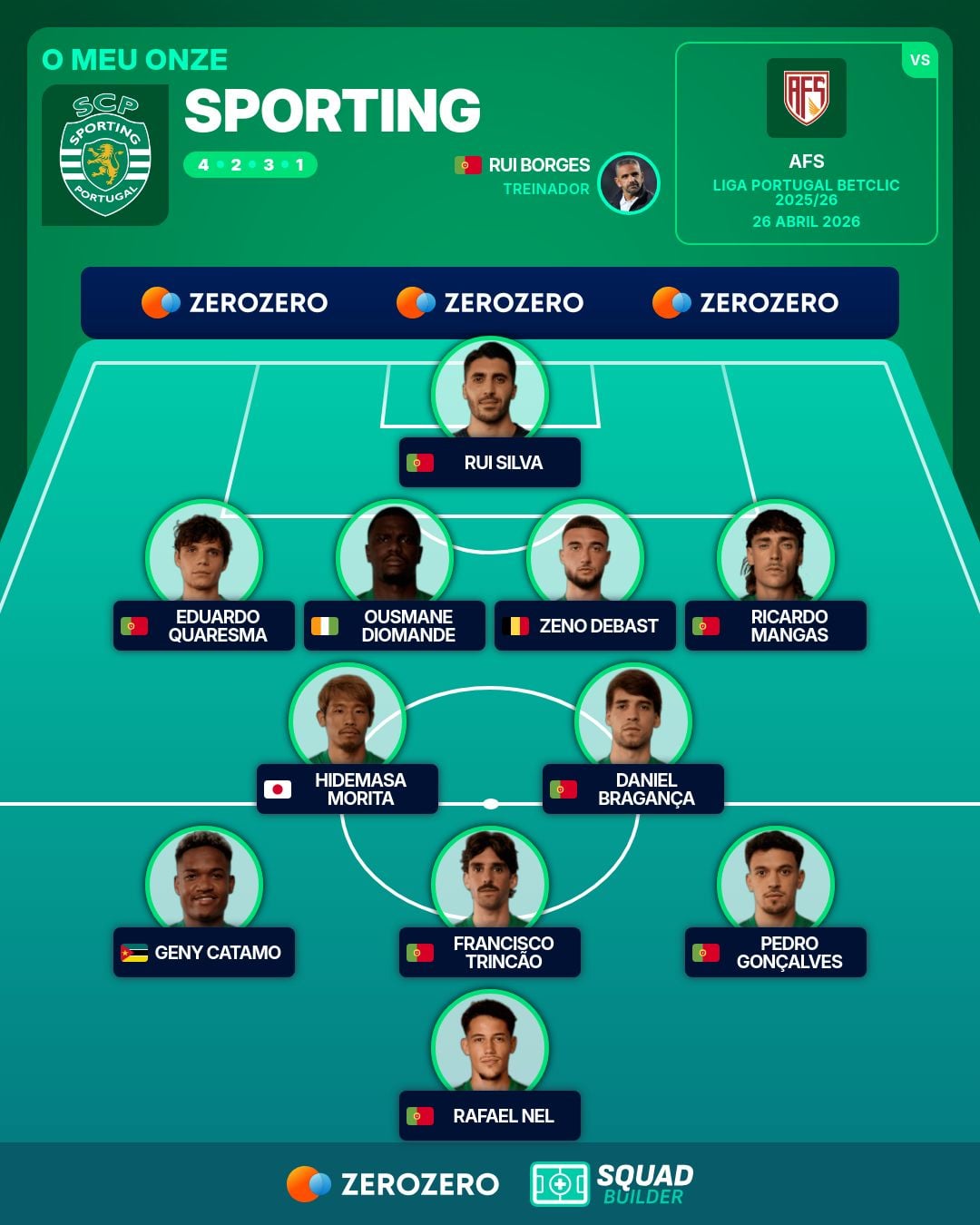 Rui Silva; Vagiannidis; Debast; Quaresma; Mangas; Hjulmand; Kocho; Pote; Quenda; Bragança e Nel.