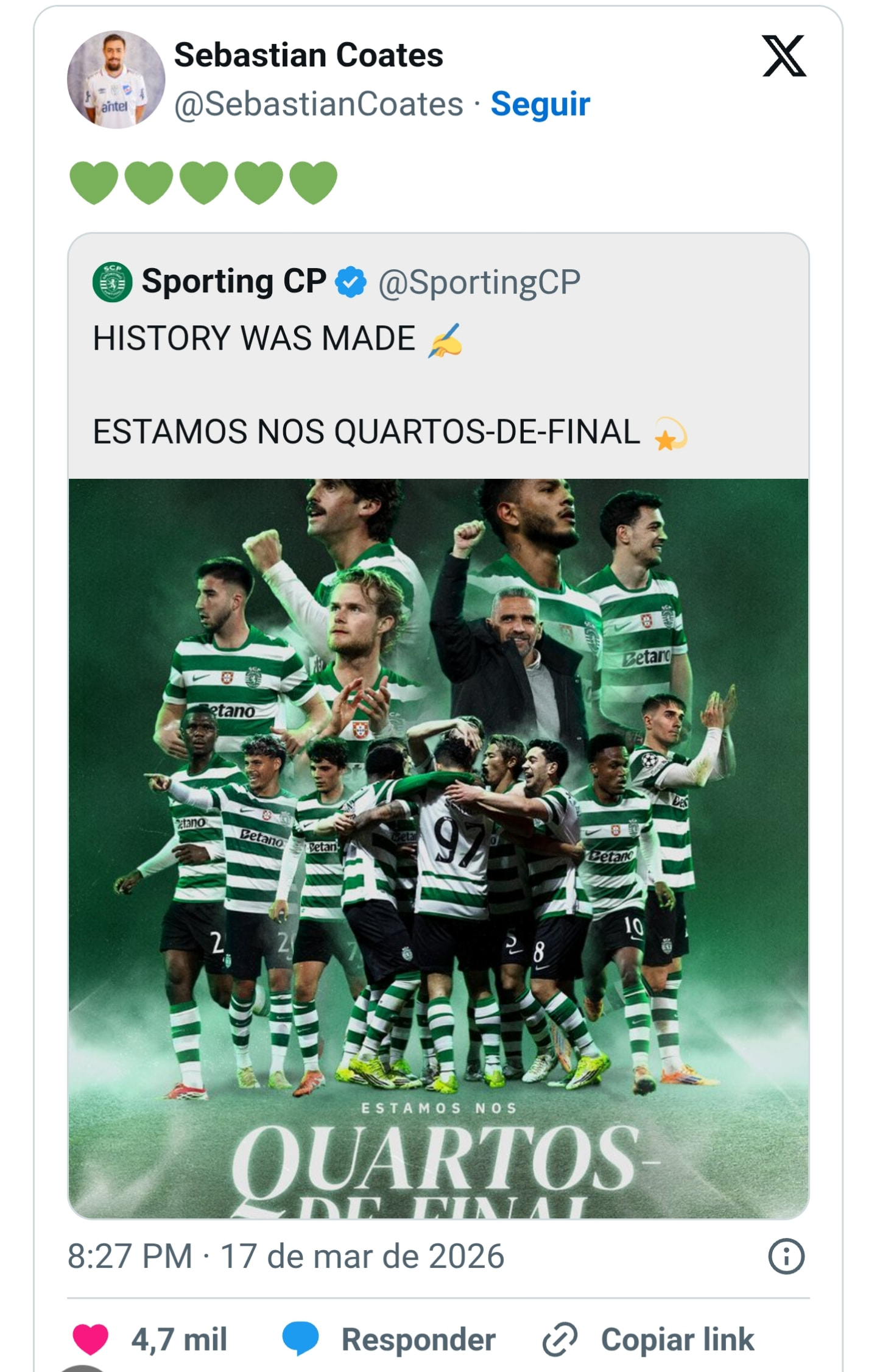 Eu SENTI fisicamente a energia que veio de Alvalade. Creio que foi no exato momento do nosso segundo golo. Eu estou no Brasil, a ver por um stream, então tem um delay. E estava o Fresneda a passar a bola a alguém, ainda junto da nossa área, uns 45 segundos antes do Pote marcar, e tudo o que estava a sentir nos últimos dias passou, fiquei perfeito por instantes. Senti um calor e uma sensação de bem estar nesse momento, tudo ficou perfeito na minha vida. E nesse momento, instintivamente, soube que o Sporting tinha marcado. Comecei a festejar, 30 segundos depois o Pote mete-a lá dentro.