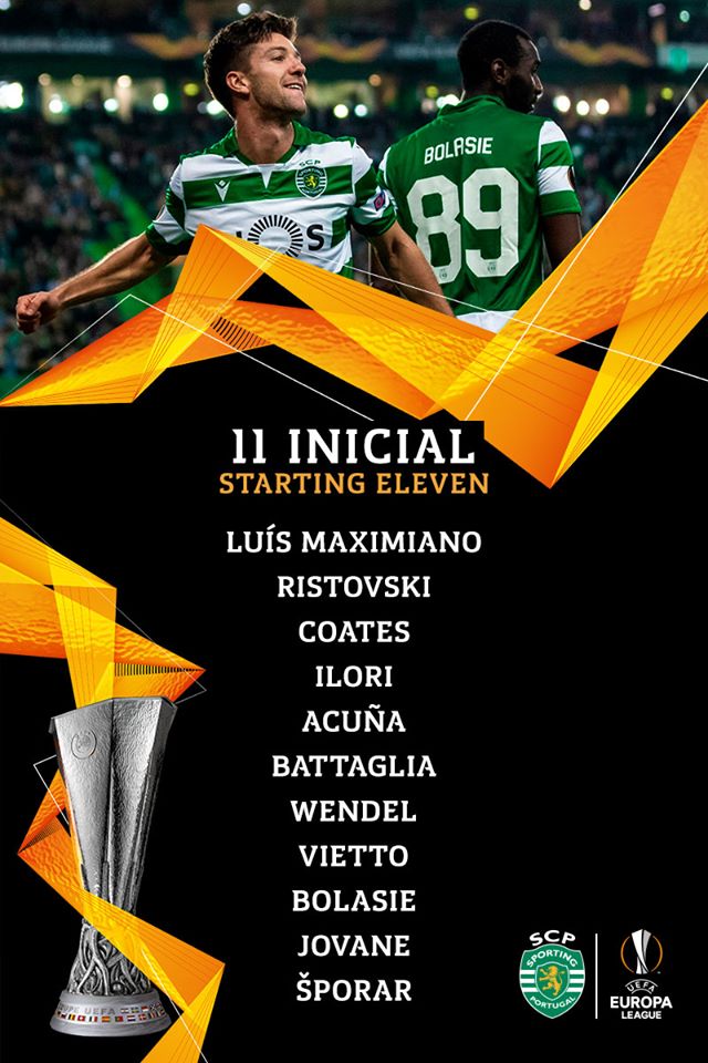 ONZE DO SPORTING: Luís Maximiano; Ristovski, Coates, Ilori e Acuña; Battaglia e Wendel; Jovane, Vietto e Bolasie; Sporar