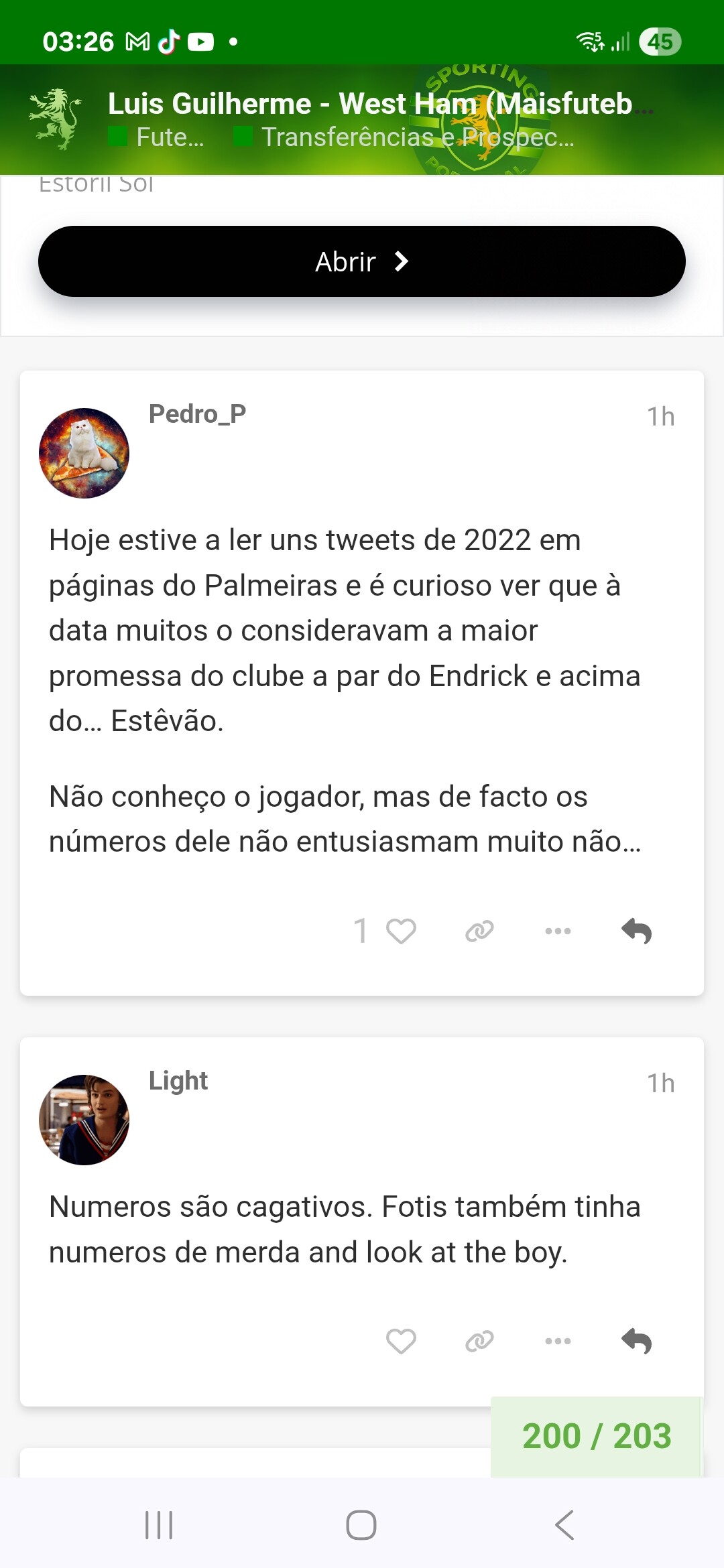 Se confirmar a informação que o @Pedro_P pesquisou que Luis Guilherme estava no mesmo nível do Endrick e acima do Estevão das maiores esperanças do Palmeiras, isto entre 15M€ e 18M€, segundo o que circula por aí.