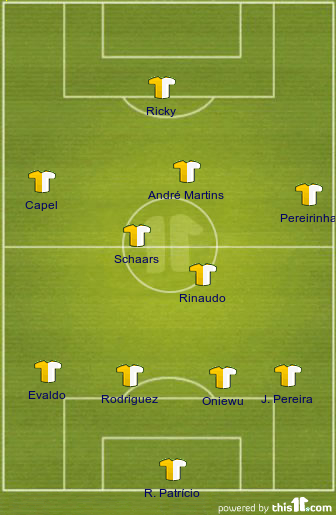 Meio campo com o pulmão Rinaudo e o patrão Schaars indiscutiveis. Extremos bem abertos, Capel e Carrillo, os mais rápidos e tecnicistas. Izma não me parece estar em condições e Djaló só se engana uma vez ou outra.