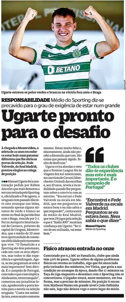 Questionado pela rádio local ‘Sport890’, meio que tratou de cobrir a chegada de vários atletas convocados pelo selecionador uruguaio Óscar Tabárez, sobre a mudança de patamar em Portugal, Ugarte denotou a maior exigência do Sporting.