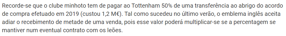 Recorde-se que o clube minhoto tem de pagar ao Tottenham 50% de uma transferência ao abrigo do acordo de compra efetuado em 2019 (custou 1,2 M€). Tal como sucedeu no último verão, o emblema inglês aceita adiar o recebimento de metade de uma venda, pois esse valor poderá multiplicar-se se a percentagem se mantiver num eventual contrato com os leões.