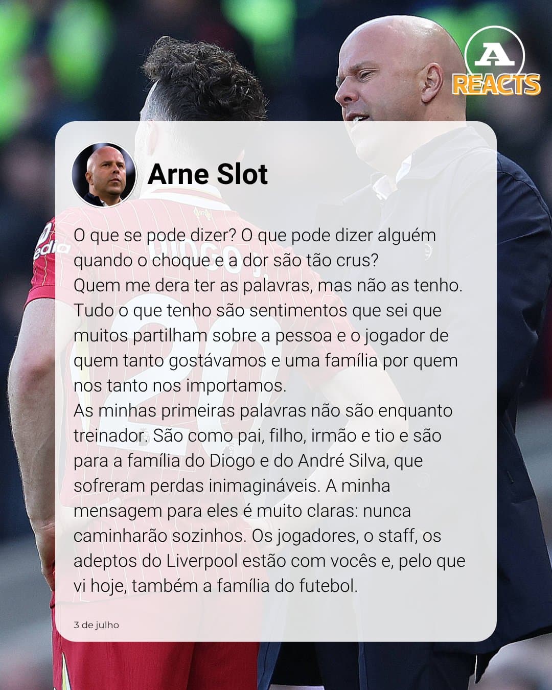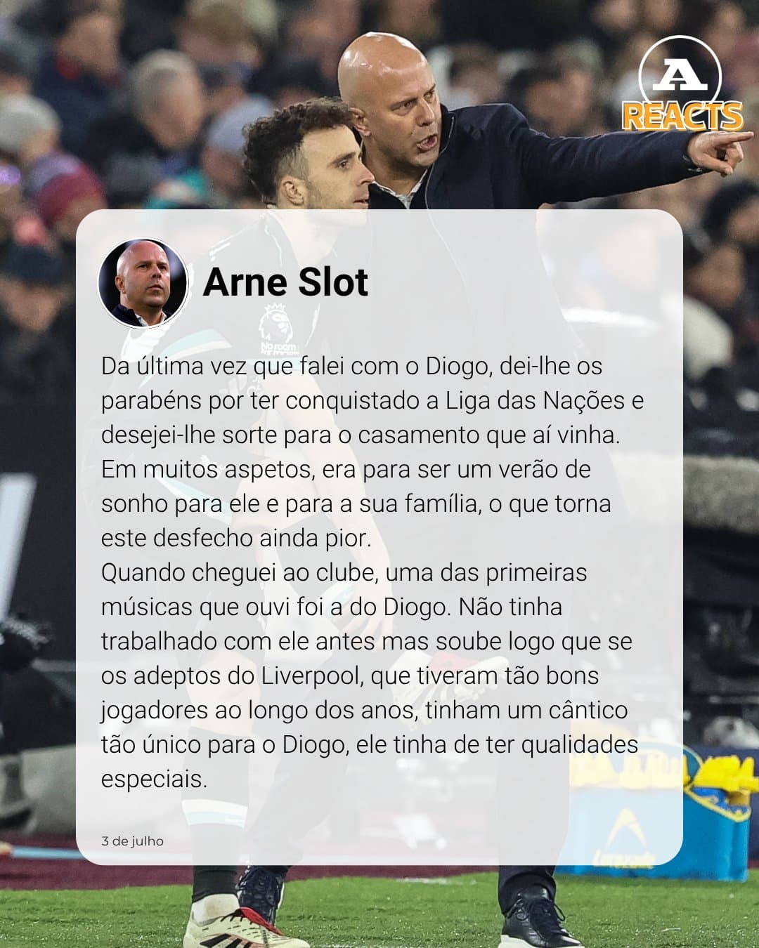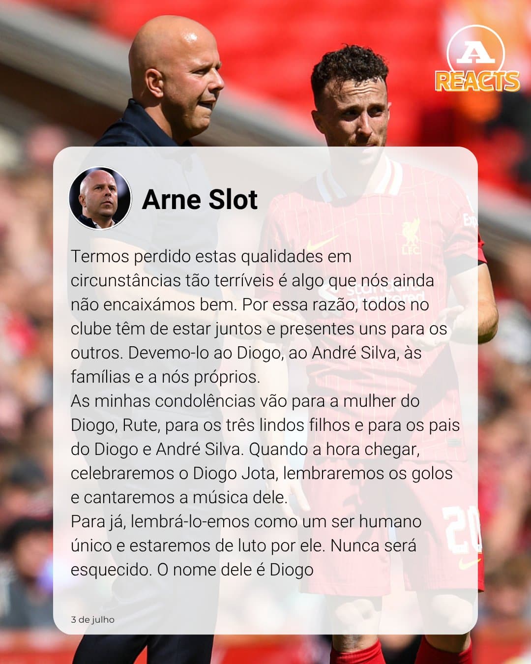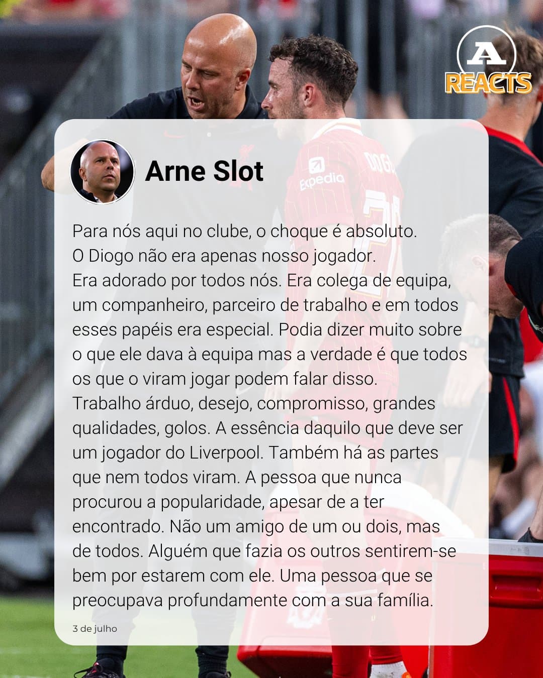 Que notícia triste! Fiquei devastado, como pessoa cujo Liverpool é o segundo clube era uma pessoa que tinha muito carinho pelo Diogo Jota. Nunca vou esquecer o impacto que teve quando chegou em 20/21 e parecia que resolvia os jogos sozinhos na pior fase do Klopp. Vai fazer imensa falta. É incrível como as coisas acontecem e como tudo pode mudar num segundo. Descansa em paz Diogo Jota!