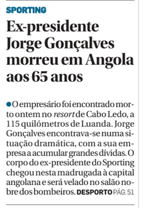 Influente empresário e destacada figura na alta sociedade angolana, o suicídio de Jorge Gonçalves, popularmente conhecido no futebol português como o bigodes, motivou ontem um clima de grande consternação.