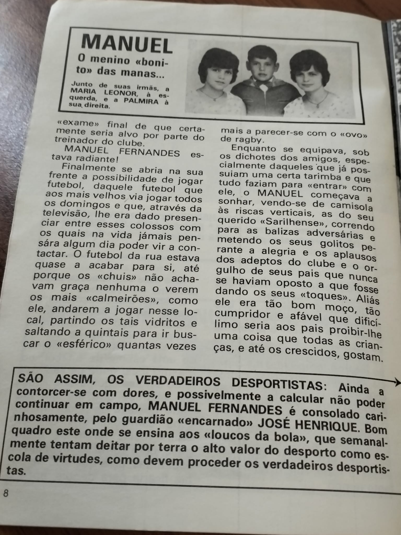 A sua morte faz-me refletir sobre a brevidade da vida e o quanto temos que aproveitar cada momento. Independentemente do que o Sporting seja para cada um, ouvir as palavras do Manel, já com uma certa idade, sobre o seu sonho de menino, um menino de Sarilhos Pequeno, não pode deixar uma pessoa indiferente. Tinha o sonho de jogar futebol, se possível pelo seu Sporting… e ver o orgulho dele ao olhar pra trás e ter deixado o menino de Sarilhos Pequenos com um sorriso… tanto parte-me, como me enche o coração.