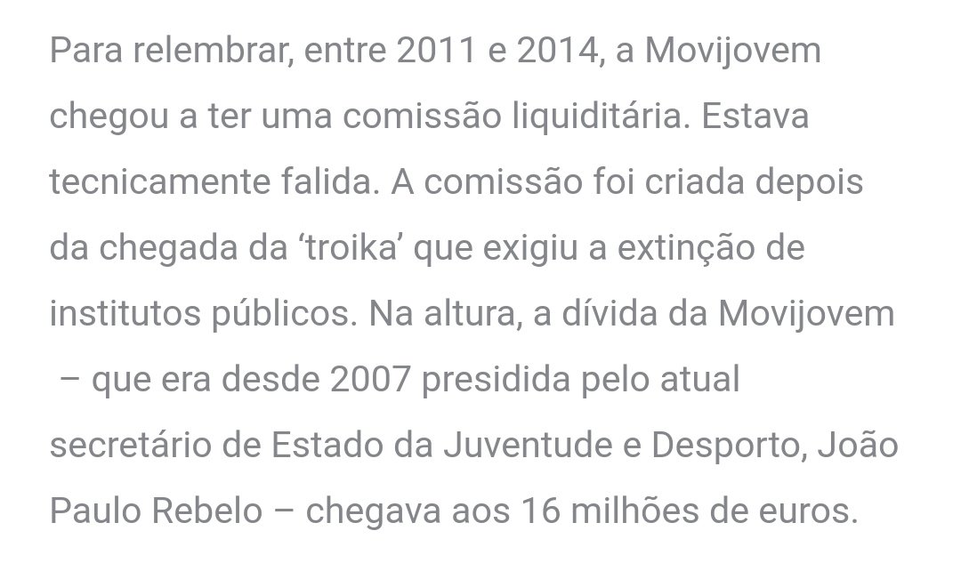 Para relembrar, entre 2011 e 2014, a Movijovem chegou a ter uma comissão liquiditária. Estava tecnicamente falida. A comissão foi criada depois da chegada da ‘troika’ que exigiu a extinção de institutos públicos. Na altura, a dívida da Movijovem – que era desde 2007 presidida pelo atual secretário de Estado da Juventude e Desporto, João Paulo Rebelo – chegava aos 16 milhões de euros.