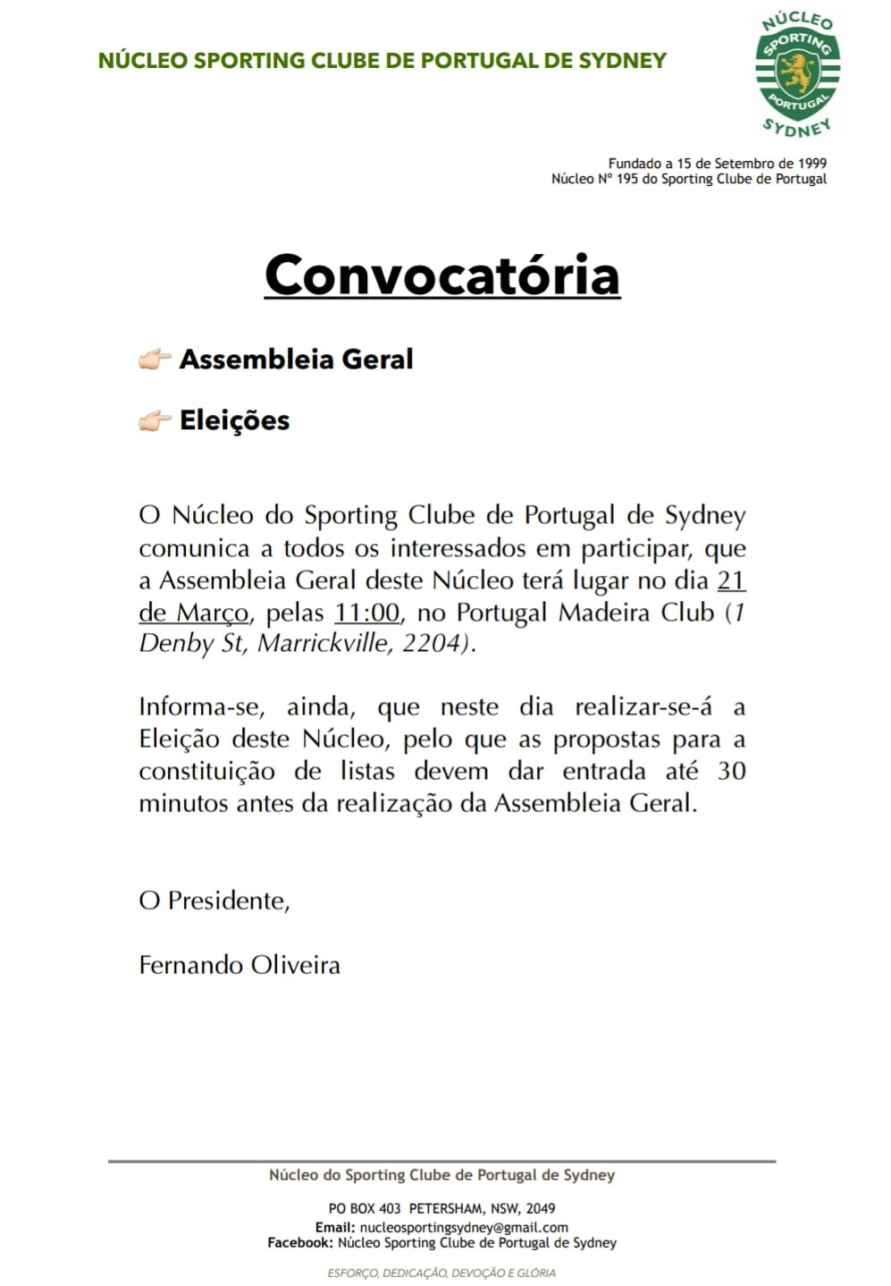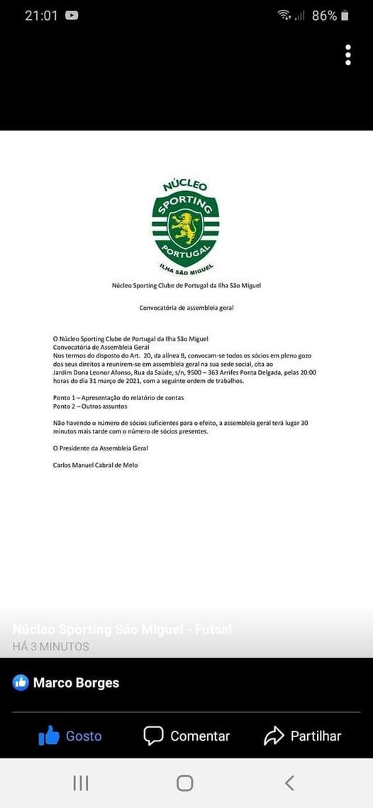Além da apresentação do relatório e contas do ano 2020 e das eleições para os novos órgãos Sociais a Assembleia Geral é o local para se decidir e discutir o Futuro do Núcleo por isso assim que seja possível efetua lá será comunicado a Todos os Sócios por convocatória Oficial.