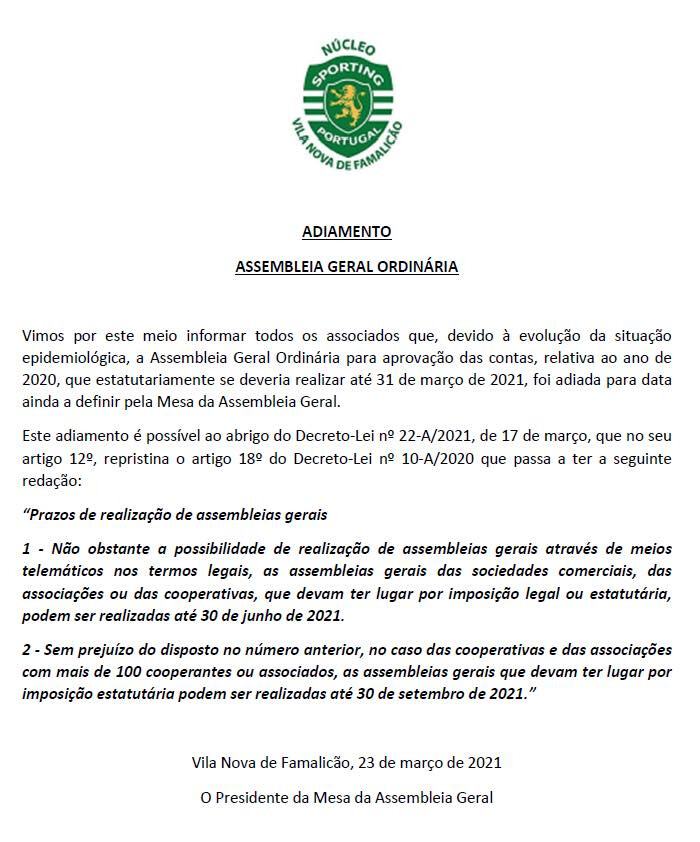 Informamos todos os Sócios do Núcleo SCP de Braga que a Assembleia Geral que segundo os estatutos deve ser realizada até dia 31 Março este ano e mais uma vez não será possível ser realizada devido á situação que infelizmente vivemos com a Pandemia COVID 19.