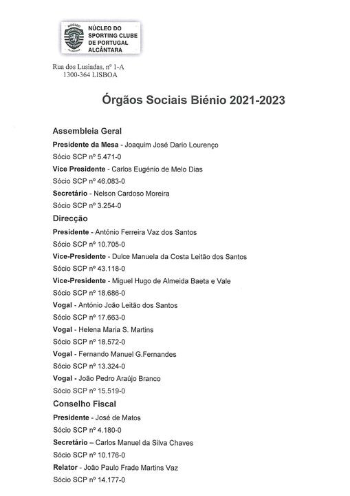 Para conhecimento dos associados que não puderam estar presentes na Assembleia Geral realizada ontem, 30 de Maio de 2021, às 15h00 na Sede do Nucleo, aqui fica lista que foi reeleita para 2021-2023.SL