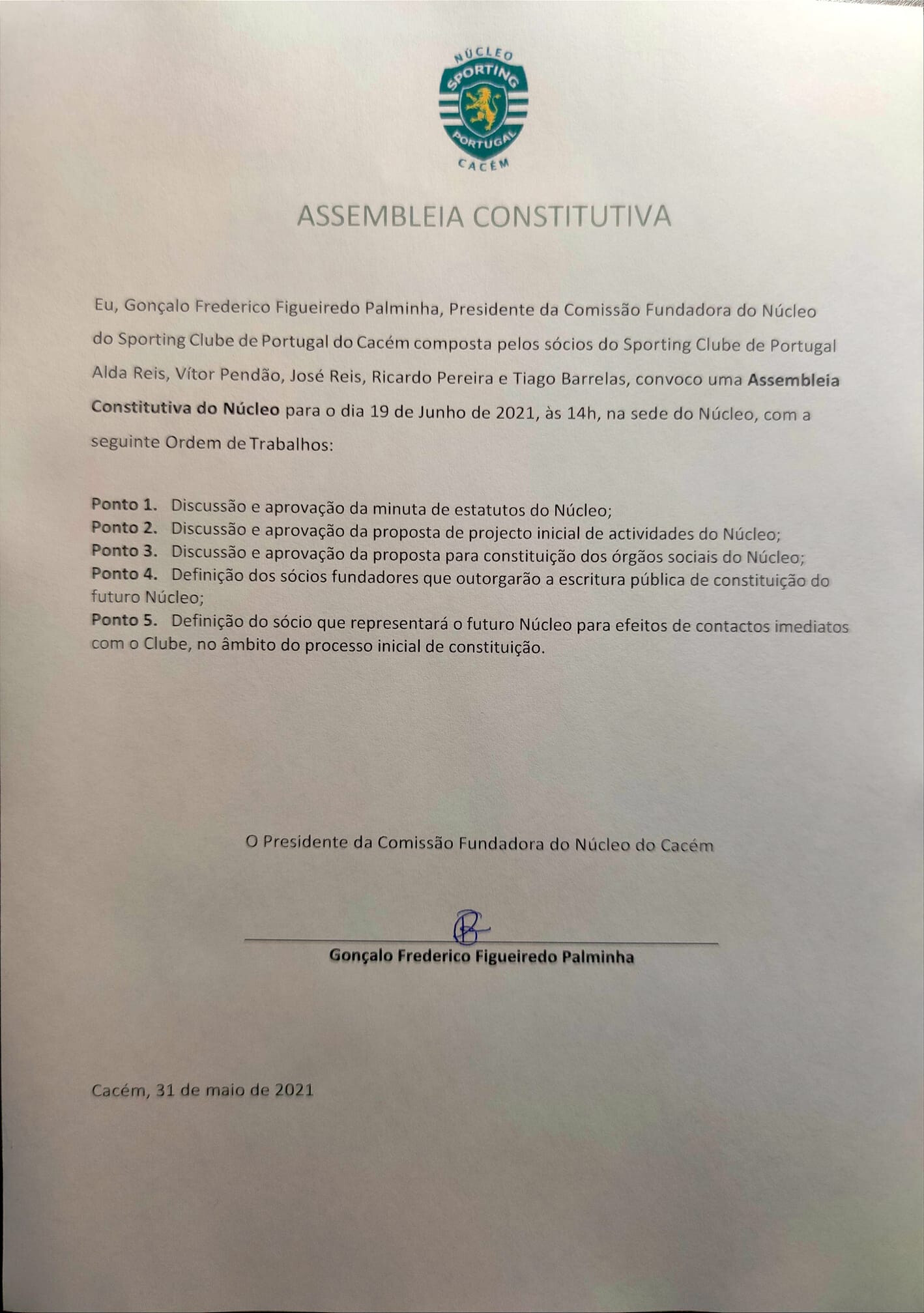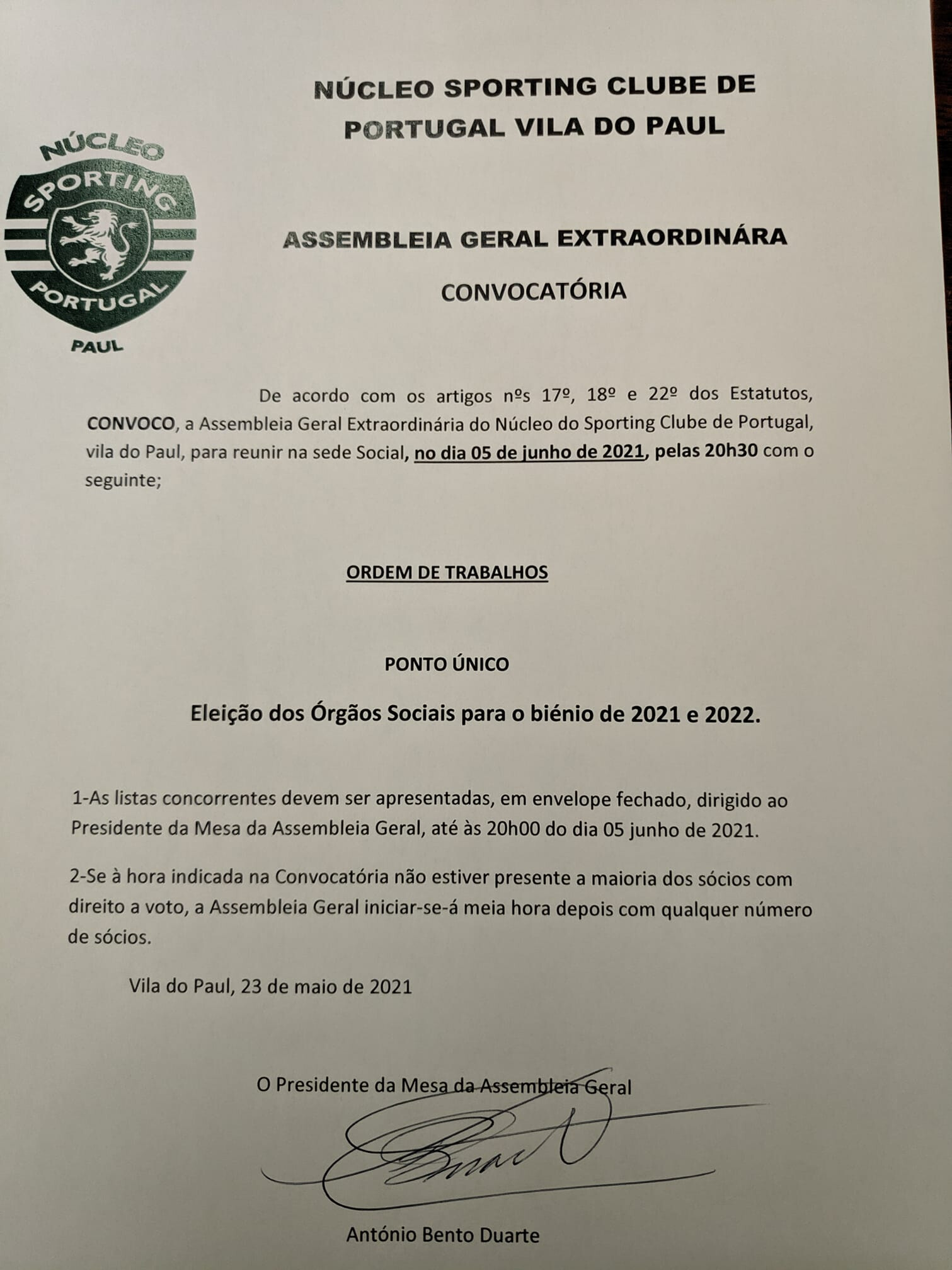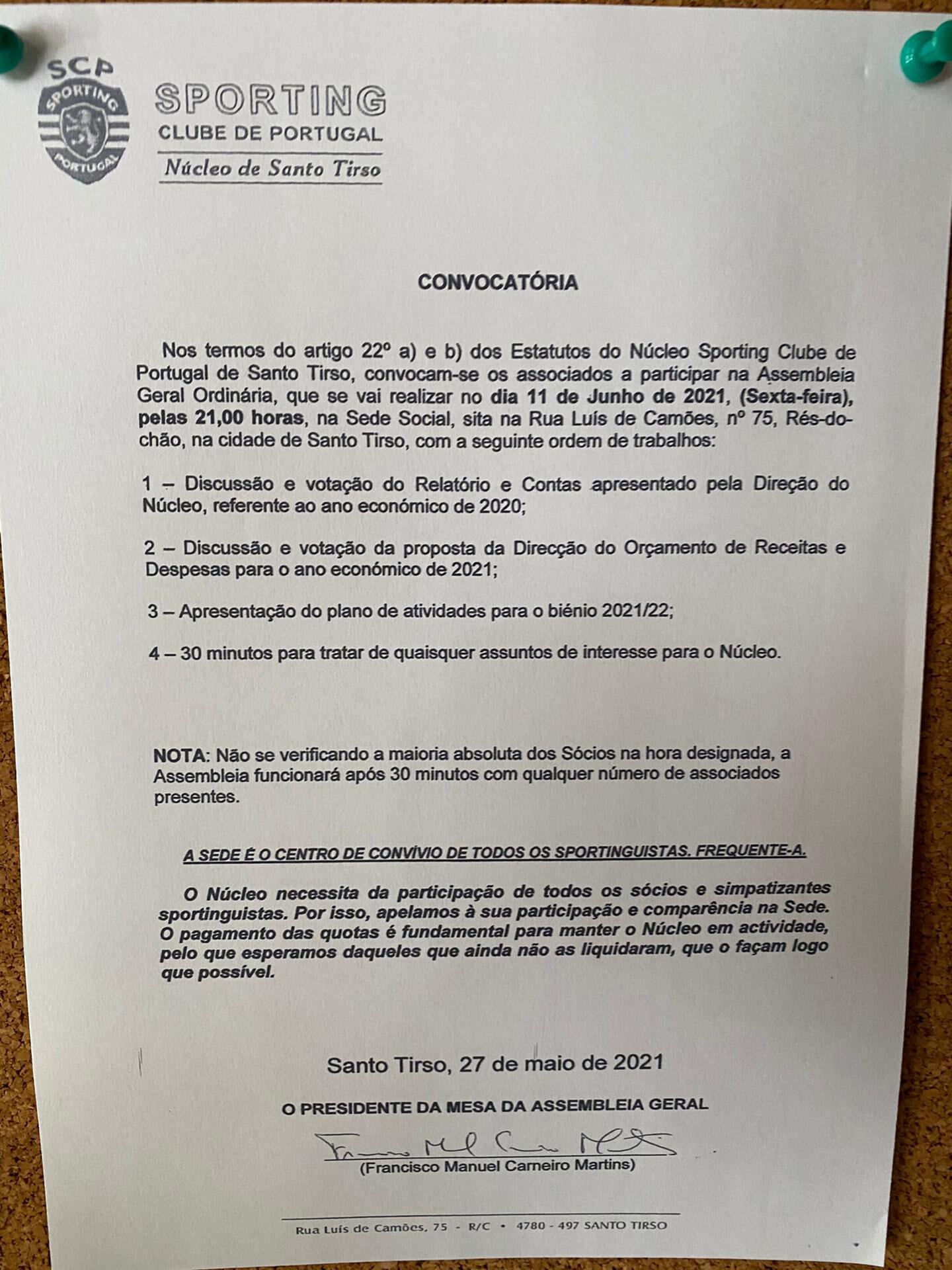 Ao abrigo dos Estatutos do NSCPS e do SCP, vai o NSCPS reunir em AG ordinária, para apresentação e votação de contas de 2020, prestação de informações e discussão de outros assuntos de interesse para o Núcleo, no próximo dia 19 de junho, pelas 14.30 horas, na sede.