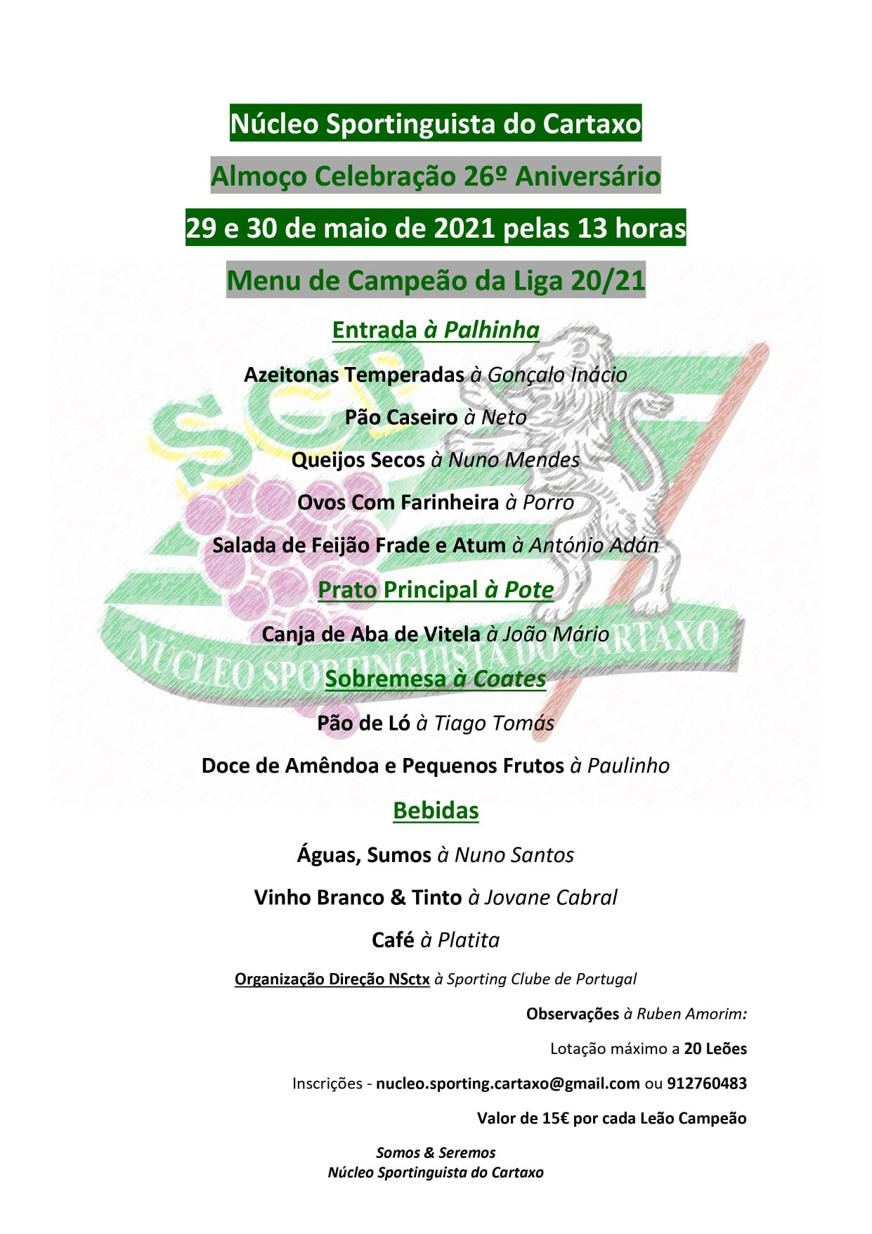 Estes almoços servirão para celebrar o 26º Aniversário do Núcleo, os nossos títulos ganhos nas diversas modalidades leoninas e para apoiar o Núcleo na difícil caminhada que atravessamos.