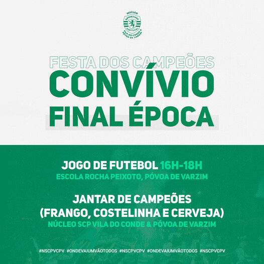 Convívio Sportinguista do Núcleo de Viana do Castelo do Sporting Clube de Portugal, no próximo dia 06 de Junho de 2021, junta-te a nós no “Almoço de Campeões”, um evento que visa celebrar as mais recentes conquistas e assinalar o final de época desportiva, Assim, a partir das 13h do dia 06/06 iremos saborear um monumental Sarrabulho à Moda do Minho", no Restaurante Camelo em Santa Marta de Portuzelo. O custo por pessoa é de 20€, sendo que as crianças até 10 anos têm desconto de 50%. Haverá animação musical, visionamento de videos com os melhores momentos desta época e algumas surpresas e muita animação, respeitando as normas de segurança da DGS. Poderão efetuar as vossas reservas através do Núcleo SCP de Viana do Castelo via e-mail: nucleo24scp@gmail.com ou telefone 960 168 800 ou diretamente com o Restaurante Camelo através do nr 937 598 565. Vem celebrar neste verdadeiro convívio sportinguista, reserva já! Saudações Leoninas! #EuSouCampeão #RugidoAltoMinhoto #OndeVaiUmVãoTodos